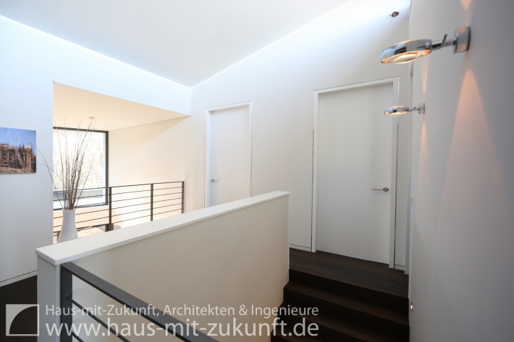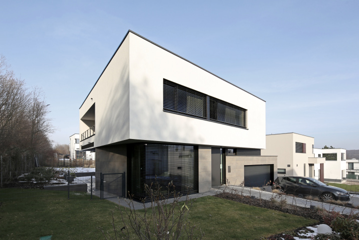 Elegant, wohnlich und funktional sollte es sein. So entstand eine Gebäudeform mit Sockel und schwebenden Obergeschoss in einer sehr frei anmutenden Gestalt, die sich ganz stark aus den inneren Funktionen entwickelt. Das Erdgeschoss mit teilintegrierter Garage wird durch seine elegante Natursteinverkleidung zum Sockel des Gebäudes. Das weiß verputzte Obergeschoss wirkt leicht und spielerisch. Die unterschiedlichen Auskragungen unterstreichen den losgelösten - schwebenden Charakter und es entstehen immer wieder unterschiedlich genutzte Überdachungen für Eingang oder Terrasse. Der Innenraum bestätigt den äußeren Eindruck. Es entsteht ein spanndes Spiel aus ungewöhnlichen Raumgeometrien und eleganter Innenraumgestaltung.