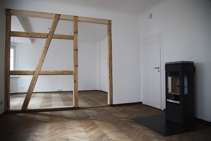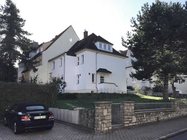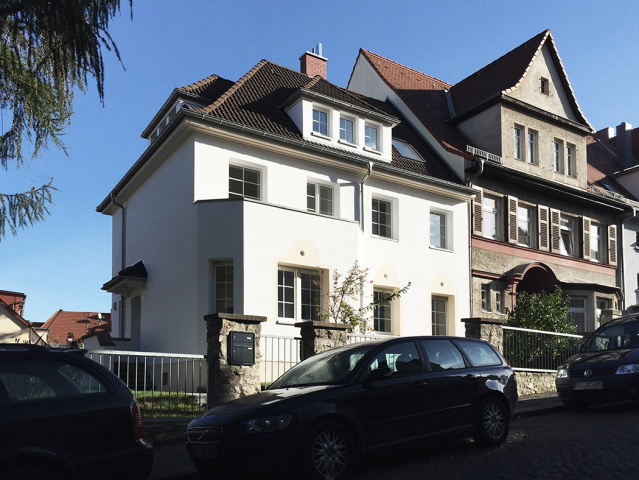 Das von Architekt BDA Heinrich Herrling geplante Wohnhaus wurde 1923-24 in Massivbauweise mit Holzbalkendecken errichtet. Die verputzten Loch-Fassaden bestehen aus Ziegelsteinmauerwerk und sind in den 90er Jahren mit Aluminium-Panel-Fassadenplatten bekleidet worden. Im Zuge der Modernisierungsmaßnahmen ist der Abbruch dieser Fassadendämmplatten und die Herstellung eines WDVS aus mineralischen Baustoffen geplant. Die ebenfalls bestehende Dachdeckung aus Ziegelsteinen soll erhalten bleiben, der Ausbau der thermischen Hülle erfolgt im Dachgeschoss von Innen (Zwischensparrendämmung). Im Dachgeschoss wird im Zuge der Ausbaumaßnahmen ein Wohnraumausstiegsfenster (90 x 120cm) auf der Straßenseite hergestellt, um den 2. Rettungsweg zu gewährleisten. Zwei Dachflächenfenster im Nord-Osten sorgen für Belichtung und Querlüftung des Dachgeschosses. Tragende Bauteile bleiben von der Baumaßnahme unberührt, die Herstellung der nicht tragenden Innenwände im Ober- und Dachgeschoss erfolgt in Leichtbauweise (Trockenbau). Sämtliche Wohnräume werden mit Parkettboden ausgestattet, die Bäder sollen mit Feinsteinzeug belegt werden. Die Hauseingangstüren werden erneuert, die bestehenden KS-Fenster (ebenfalls in den 90er Jahren hergestellt) werden entsprechend dem Stand der Technik modernisiert.