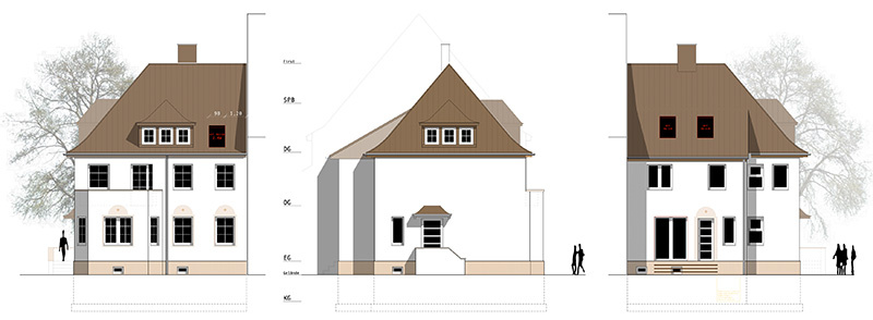 Das bestehende Dachgeschoss des Gebäudes wird ausgebaut, die Wohnräume sollen die Raumhöhe bis in den First ausfüllen. Der Spitzboden entfällt. Das Erdgeschoss wird modernisiert und der Grundriss durch subtile Eingriffe in den Bestand einer zeitgemäß offenen Wohnnutzung zugeführt (Verbindung Kochen - Essen - Wohnen), auch um die natürliche Belichtung und Belüftung des Hauses zu verbessern. Auf der Gartenseite (Nord-Ost-Fassade) soll durch Herstellen einer Terrassentür ein direkter Zugang zum Garten geschaffen werden. Im Obergeschoss wird das Badezimmer saniert und für das Elternschlafzimmer eine zusätzliche Nasszelle geschaffen. Die Nutzung im Kellergeschoss als Lager- und Technikräume bleibt bestehen. Der Garten bleibt weitestgehend wie bestehend erhalten, die Terrassenfläche werden neu angelegt. Das Wohnhaus soll künftig eine 5-köpfige Familie (Elternpaar mit 3 Kindern) beherbergen können.
