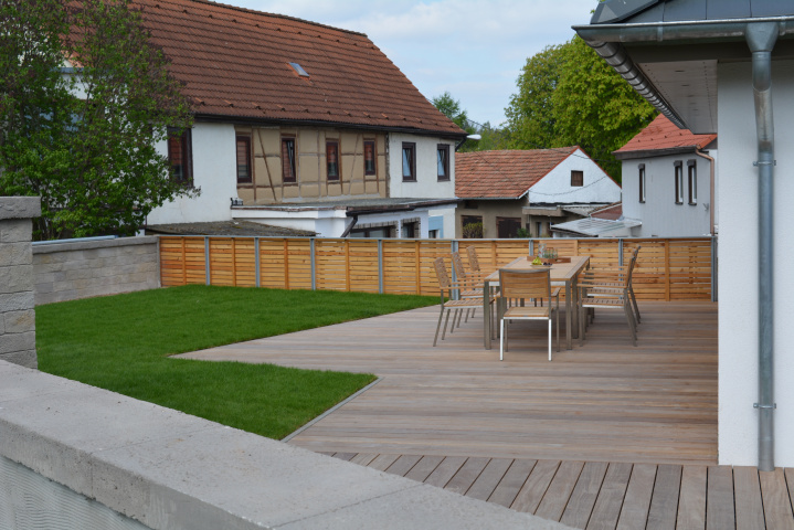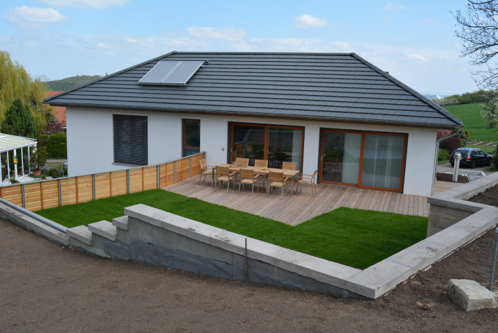Eine Stützmauer trennt die weitläufige Terrasse mit Sonnendeck und Sitzecke vom Hochgarten. Dort wird ein kleiner Obst- und Gemüsegarten angelegt. Auf einem erhalten gebliebenen Turmstumpf mit 1,4 Meter dicken Wänden wurde ein Gründach aufgebaut und in die Terrassenebene integriert.