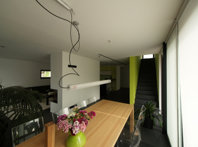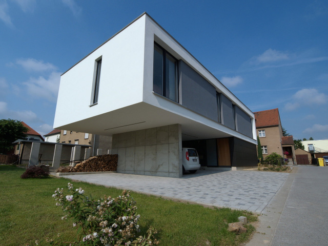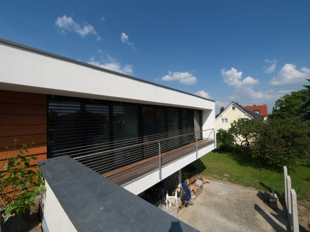 Der Ausblick aus den Räumen im Obergeschoss in den unverbauten grünen Innenbereich des Wohngebiets und darüber hinaus in die Landschaft Lausitzer Bergland waren zudem ein weiterer Entwurfsansatz. Das Erdgeschoss schafft über große Verglasungen mit Schiebtür ebenerdig die direkte Anbindung an Terrasse und Garten und trägt dem individuellen Privatleben der Bauherrschaft Rechnung.