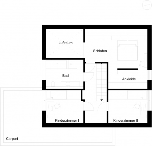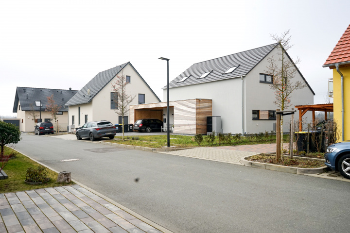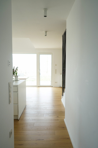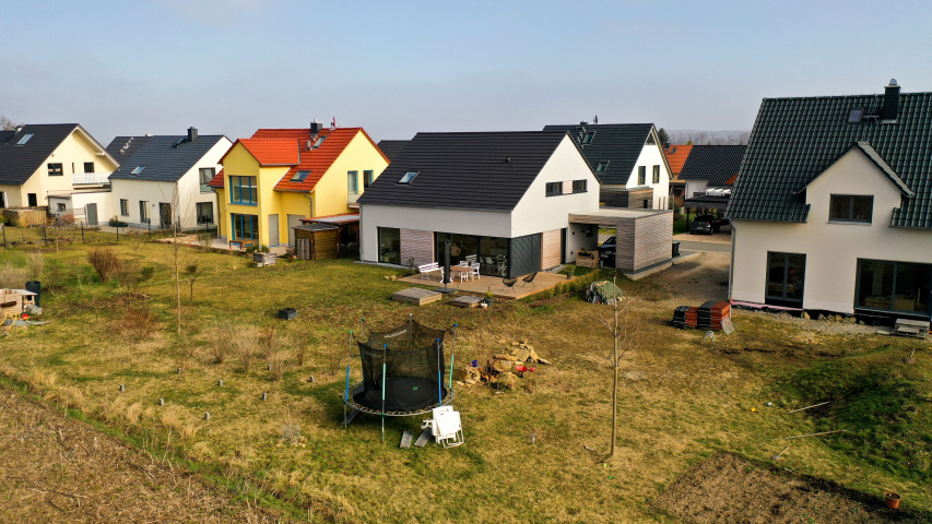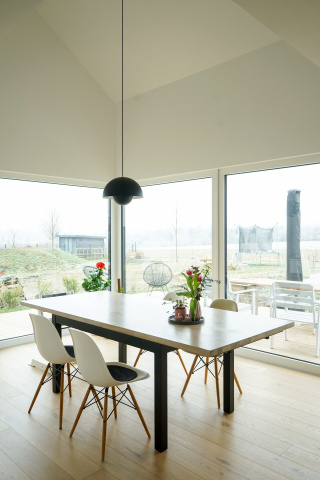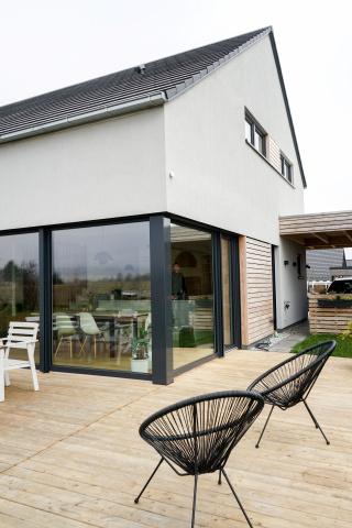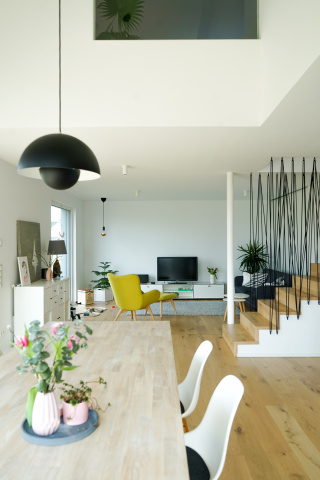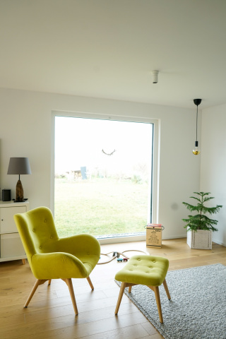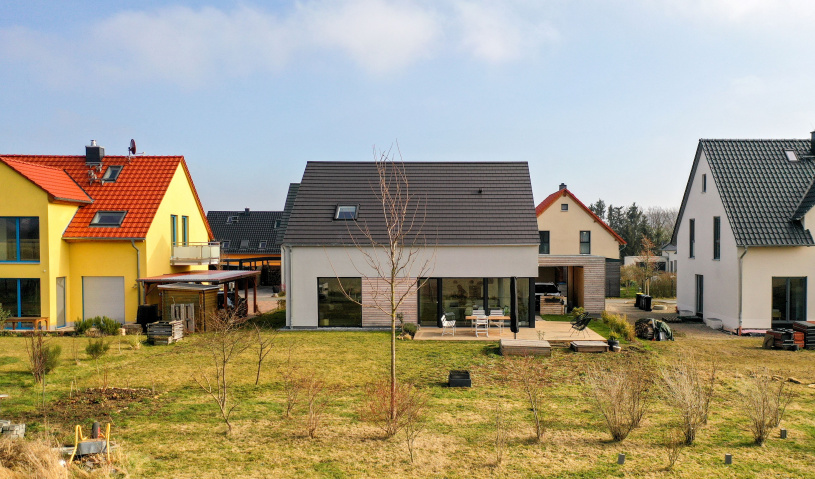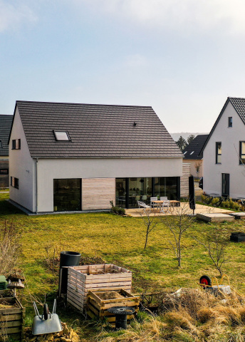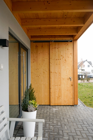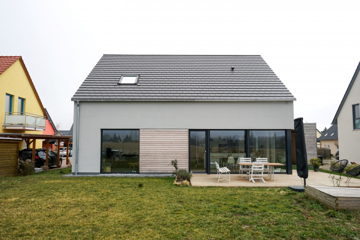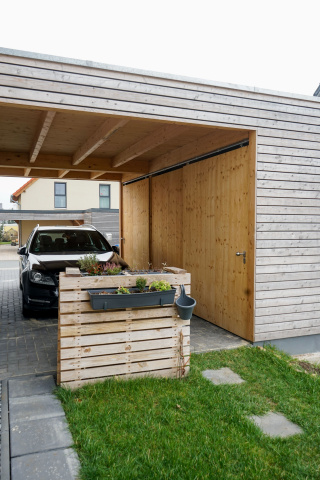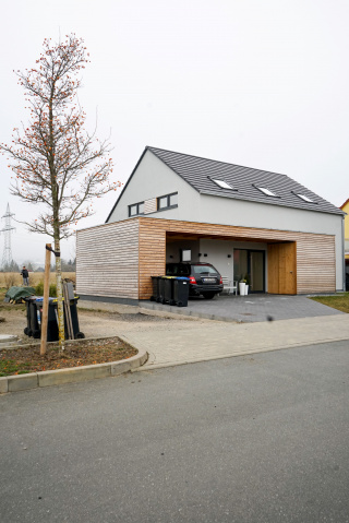 Mit dem Haus R wurde ein ökologisch nachhaltiges Haus aus dem nachwachsenden Rohstoff Holz geschaffen. Es wurde im Werk komplett vorgefertigt und binnen 2 Tagen auf der Baustelle samt Dach, Innenwänden und der Holzfassade errichtet. Das Einfamilienhaus mit Carport liegt in einem neuen Wohngebiet und besticht durch eine klare Formsprache. Über den Carport gelangt man über ein Entrée mit Garderobe in einen offenen Koch-, Ess- und Wohnbereich mit großzügigen Fensteröffnungen, die den Ausblick über das Feld einfangen. Gegliedert werden die Bereiche durch eine offene einläufige Treppe. Über den Essbereich befindet sich ein großzügiger Luftraum, der bis unter den Giebel erlebbar wird. Ein innenliegendes Fenster im Luftraum ermöglicht Einblicke in das Haus aus einer anderen Perspektive.
