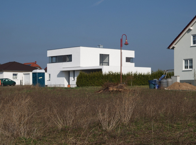 Im Jahr 1996 ist der Bebauungsplan von der Gemeinde für das Baugebiet aufgestellt worden. Die Bauinteressenten kamen nicht wie erhofft; lediglich ein Drittel der Baufelder sind bebaut. Für die Bauherren, seit Kindheit mit dem Ort verbunden, hat sich die Frage nicht gestellt, den Ort zu verlassen. Jedoch musste früh in der Entwurfsphase festgestellt werden, dass unter Einhaltung der Festlegungen im Bebauungsplan, Kostenbudget und das notwendige Raumprogramm für eine Familie mit drei Kindern nicht in Einklang zu bringen waren.