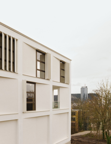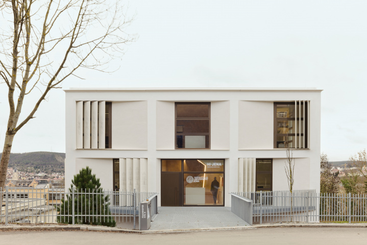 Das neue Gebäude für das Helmholtzinstitut erscheint als eigenständiger ungerichteter gleichförmiger Bau am Südhang des Jenaer Landgrafen. Zwischen den vorhandenen Forschungsgebäuden wurde der Neubau mit dem Grundvolumen eines Würfels (Kantenlänge 15m) so platziert, dass das Grundstück effizient genutzt wird, Anbindungen auf verschiedenen Geschossebenen funktionsorientiert erfolgen können und eine vermittelnde Maßstäblichkeit in der städtebaulichen Körnung zwischen den vorhandenen Villen und großen Solitärbauten erreicht wird.