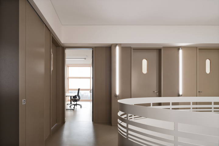 Während die Anlieferung zur Laborebene über die bestehende Grundstückseinfahrt des Helmholtz-Instituts erfolgt, die Zufahrt mit geringst möglicher Versiegelung die seitliche Stützmauer begleitet und in den Freianlagen in starker Hanglage Wegeverbindungen zwischen Bestands- und Neubau sowie zur unabhängigen mehrseitige Erreichbarkeit und technischen Andienung generiert werden, erschließt die nördliche Zugangsbrücke das neue Forschungsgebäude.