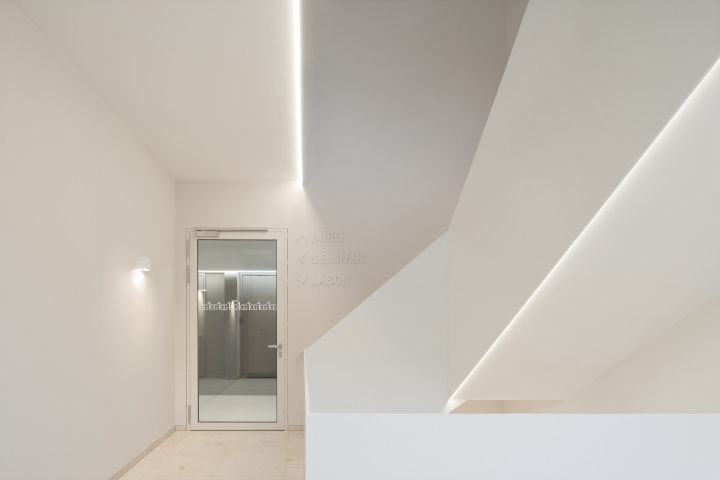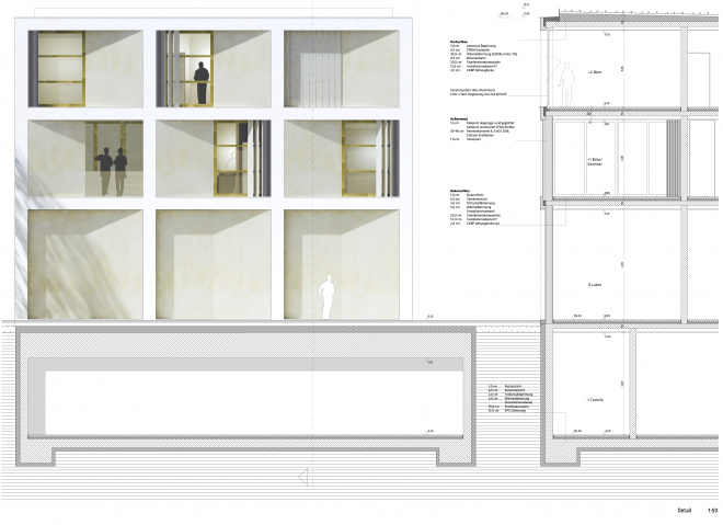 Gleichzeitig eröffnet das Ideal des Würfels neben seinem optimalen Flächen-Volumen-Verhältnis eine effektive zentrale Raumorganisation. Nach der essentiellen funktional-technischen Beamline-Anbindung des Targetraumes mittels unterirdischem Verbinder zum vorhandenen Institutsgebäude baut sich über dem Kellergeschoß mit den Technikflächen eine Stahlbetonskelettkonstruktion im Raster auf. Das Erdgeschoss auf Hangebene nimmt die Laborräume auf, die hierdurch transporttechnisch gesondert erschlossen werden können. Das 1. Obergeschoss entspricht dem Niveau der Fraunhoferstraße, so dass die Haupterschließung hier durch eine Brücke nach Norden eingerichtet wird. Dementsprechend nimmt das Geschoss im Wesentlichen erste Büros und den Seminarraum auf, der teilbar und in Raummaximierung zum Foyer angeboten wird. Im 2. Obergeschoss werden für die weiteren Büronutzungen organisiert. Die gewählte Konstruktion erlaubt langfristig räumliche Flexibilität, Anpassungen oder auch Umbauten. Die Fassade erlaubt gleiches. Zunächst gibt sie der Grundstruktur Ausdruck. Plastische Einschnitte bilden die Raumstruktur und letztlich das Raster ab und legen ein Spiel von Licht und Schatten auf der Oberfläche an. Als nächstes wurden „Durchstoßpunkte“ im Relief der Außenhülle so angelegt, dass sie eine Entsprechung zur Funktionsbelegung haben: Fenster, Zugänge und freie Öffnungen, die auch Loggien aufnehmen und so im Grundsatz Korrespondenzen zwischen Innen und Außen erzeugt wurden, die in der allumfassenden Behandlung des Würfels als symbolischer Themenbezug zum Helmholtzinstitut hinsichtlich Wechselwirkung zwischen Licht und Materie gelesen werden können. Die Erscheinung der Fassaden ist wandelbar durch die Lichtverhältnisse, Schattenbildung in den Wandnischen, auch durch die Baumschatten; nicht zuletzt durch die Verschattungselemente, die die Fenster zur geschlossenen Fläche verwandeln und ggf. künftig auch durch potentiell weitere Fenster im Erdgeschoss.