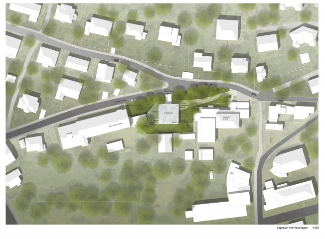 Im Freiraum bettet sich das neue Institutsgebäude durch ergänzte Stützmauern sowie durch rahmenden Bestandsgehölze und ergänzte standorttypische Bäume und Sträucher sowie bodendeckende Pflanzungen in das stark durch Topografie geprägte Grundstück ein.