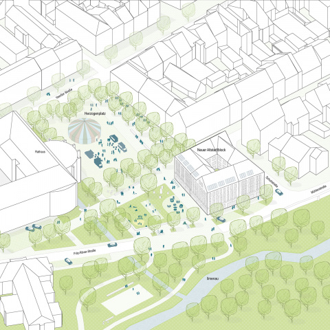 Der Freiraum südlich des neuen Altstadtblocks wird aufgewertet. Neue Freiraumnutzungen erhöhen Aufenthaltsqualität und Attraktivität der Innenstadt als Wohnort: