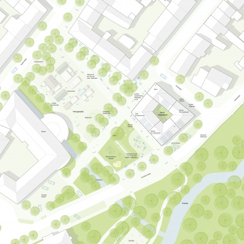 Die Konfiguration des neuen Altstadtblocks östlich des Herzogenplatzes passt sich bezüglich Dichte und Höhe an die umgebende Bebauung an und ist mit den architektonischen Richtlinien der Stadt konform. Die Platzierung der südwestlichen Fassade markiert den ehemaligen Verlauf der Stadtmauer.