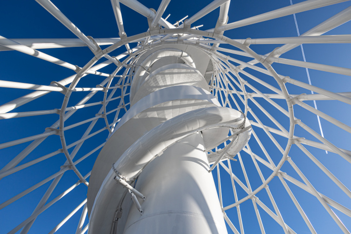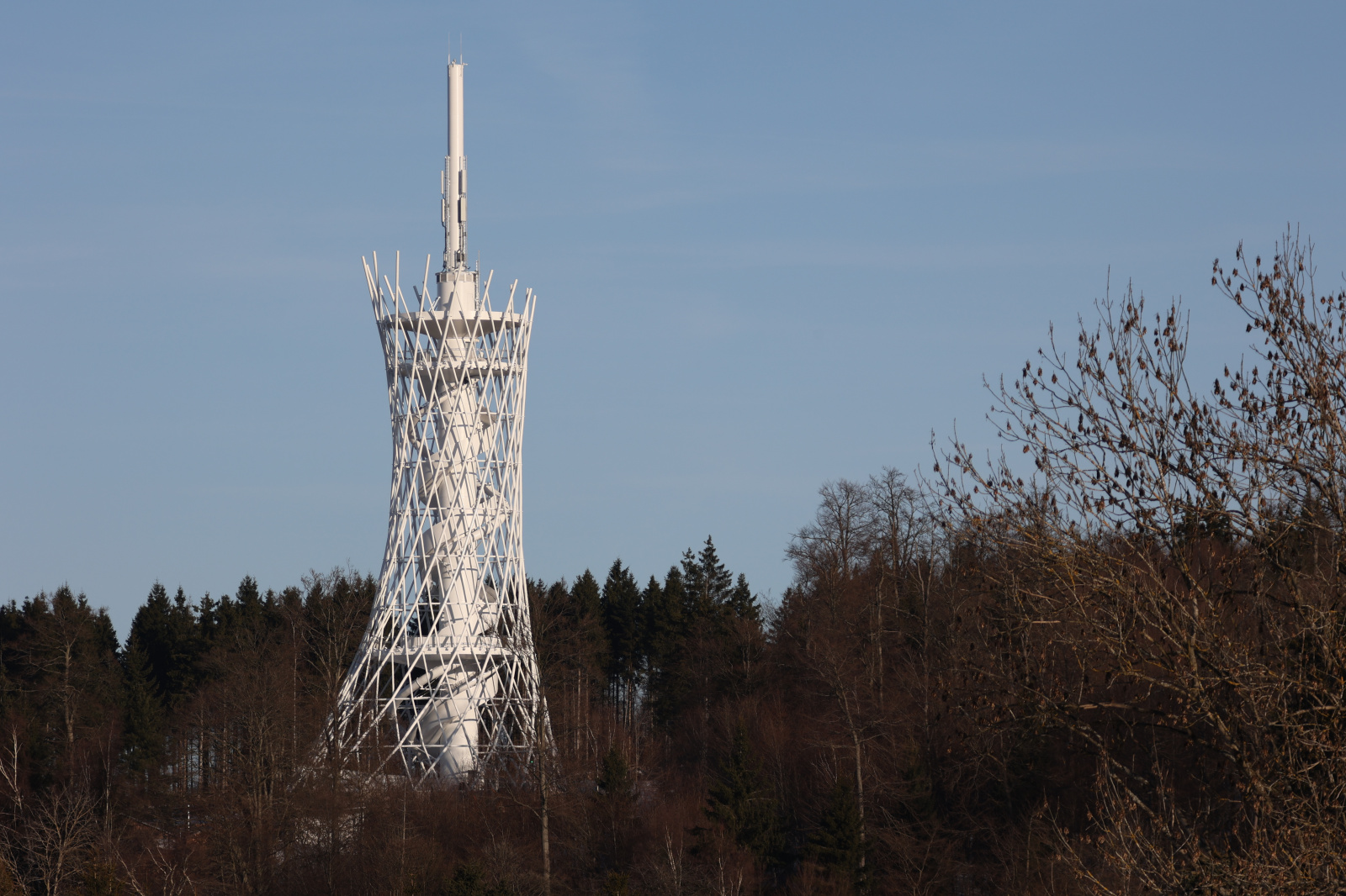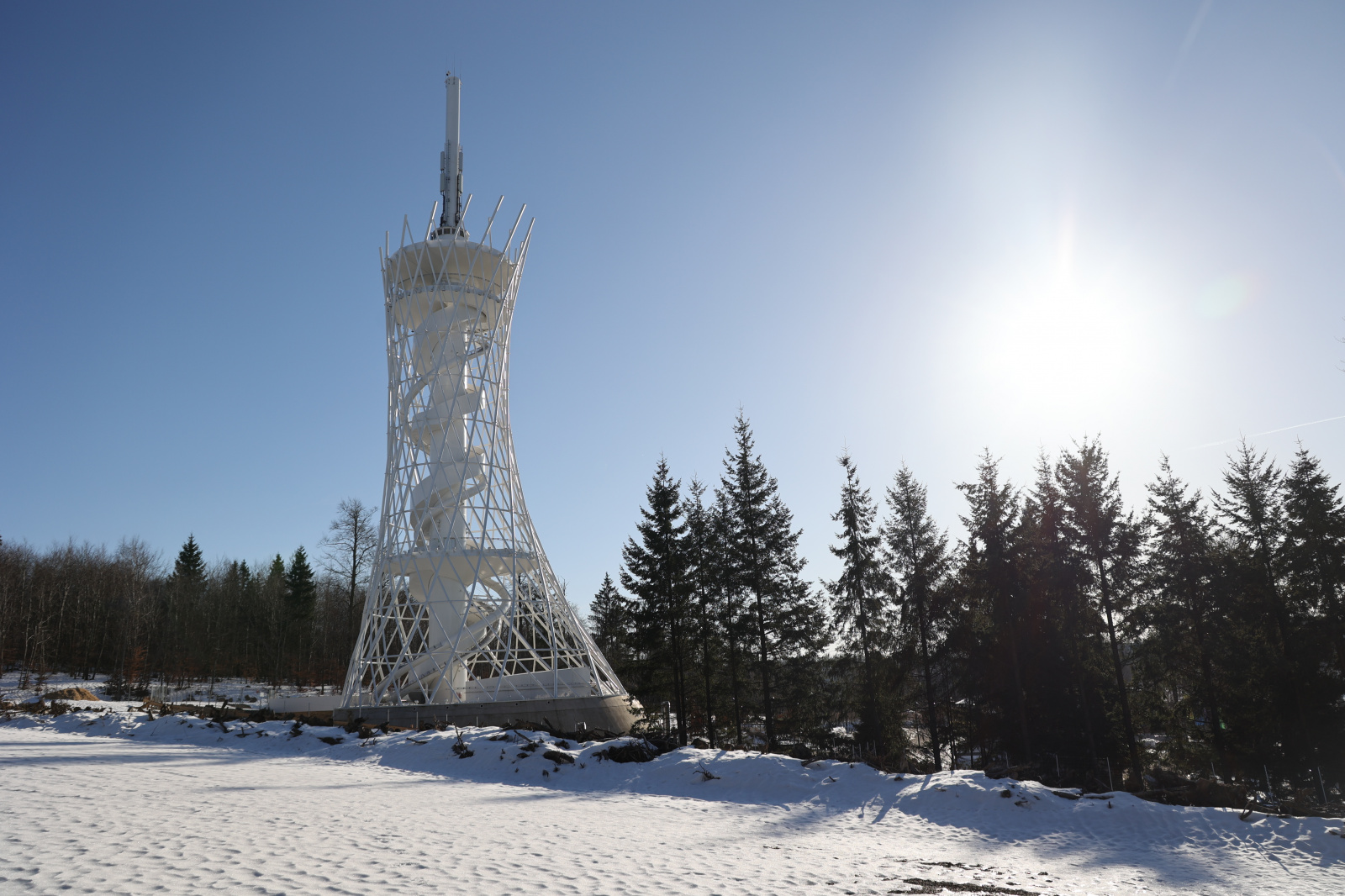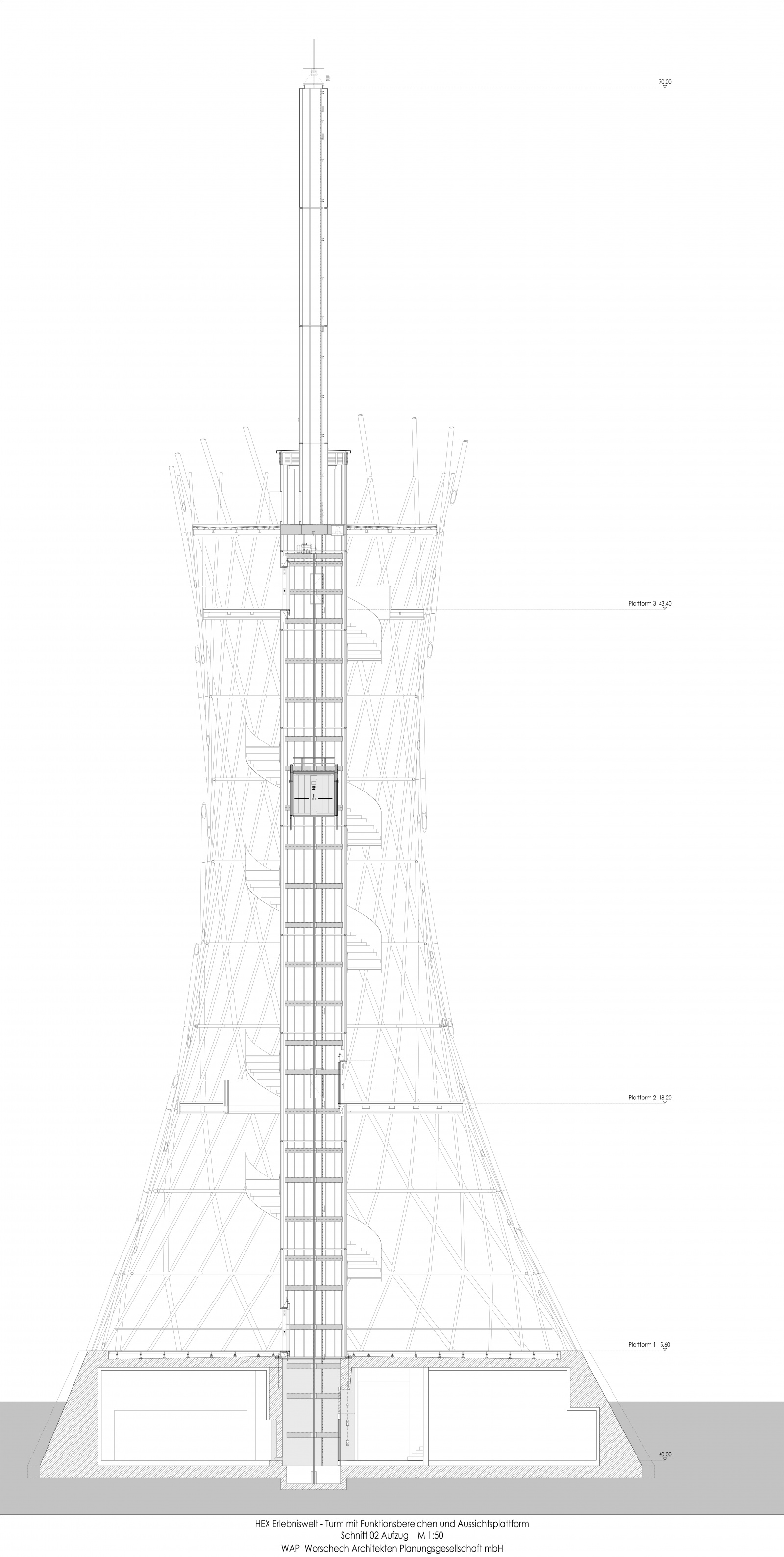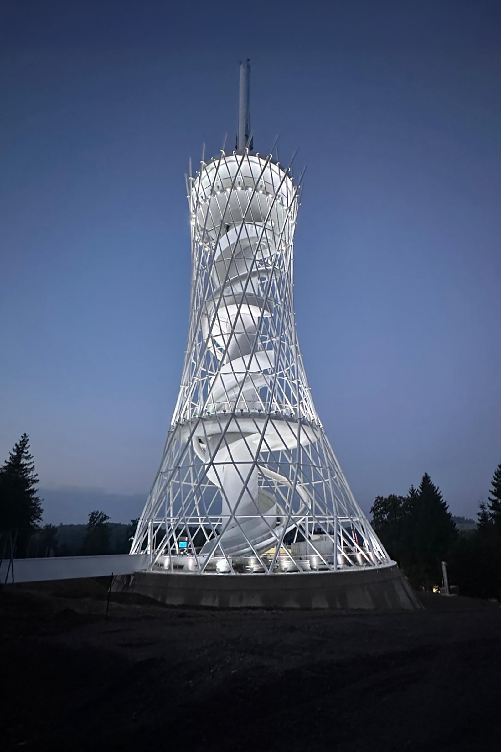 Der neue Aussichtsturm bildet die Hauptattraktion der „HEX-Erlebniswelt“ in Rothesütte, Harz. Sein Erscheinungsbild prägt eine Konstruktion aus dynamisch verwundenen Stahlrohren in Form eines asymmetrischen Rotationshyperboloids. Die weiße Beschichtung aller Stahlbauteile verleiht ihm im wahrsten Sinne eine Ausstrahlung und verbindet Turm und integrierte Erlebnisrutschen zu einer skulpturalen Einheit. Ein dynamisches Außenlichtkonzept ergänzt die Fernwirkung. Der in den monolithischen Sockel aus Schwerbeton integrierte Ausstellungs- und Shop-Bereich ermöglicht einen Ganzjahresbetrieb. Aus dem Sockel erwächst eine Stahlröhre, die den Aufzug aufnimmt und zur überdachten Aussichtsplattform in 44 m Höhe führt. Eine spiralförmig um den Kern gewundene Stahltreppe dient der fußläufigen Besteigung.