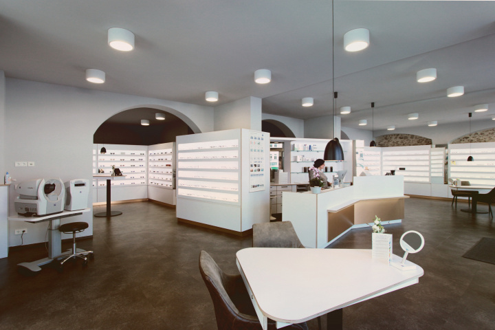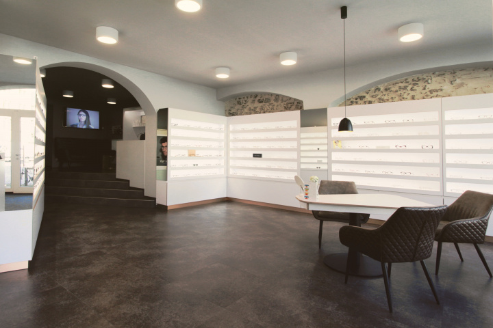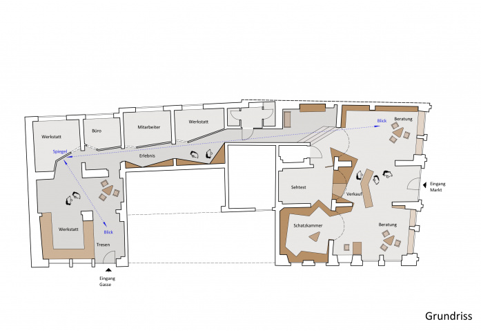 Das "zweite Haus am Platz" des Zentrums von Gera beherbergt nach der Gebäudesanierung 2015/16 neben Wohnungen in den Obergeschossen ein Optikergeschäft zweier Jungunternehmer. Es geht um Sichtweisen. Sehtradition. Präzesion. Moderne, gelaserte Wandelemente aus Schichtholz schlängeln sich durch den Raum. Verbinden Räume, deren Strukturen gebrochen werden. Immer wieder Nischen, Ecken, besondere Eindrücke. Auch der zweite Blick ist ein Erlebnis, da er die Geschichte erleben lässt. Sichtachsen verbinden die verschiedenen Bereiche des Geschäftes. Die Werkstatt, hier kann der Kunde seine Brille entstehen sehen. Und den Showroom, welcher auch im dunkeln die Blicke von der anderen Seite des Marktes auf sich zieht.
