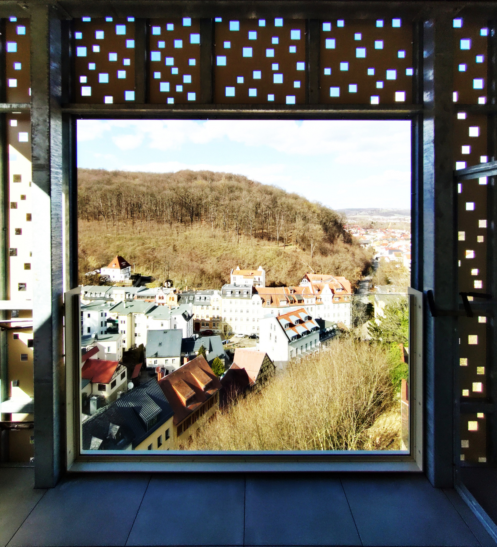 Im wesentlichen wurde die Hofseitige Fassade mit Kratzputz, den Fensteröffnungen im DDR-Optik erhalten und wurden farblich an den Bergfried so wie das Terrassencafe aus den 1960er Jahren angeglichen. Die neuen Elemente mit Lochblechfassade sind orientiert an der Gestaltung des markanten Fliesen-Brüstungsfeldes des DDR-Baus.