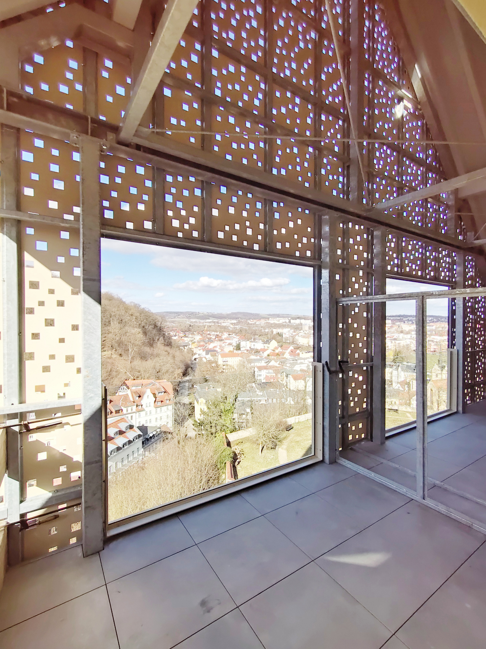 Ein stählerner Anbau beherbergt die Rettungstreppe, so wie die Freibereiche von Wohnungen. Weitere Balkone wurden sensibel an die Fassadenseiten des Schlosshofes und der südlichen Giebelseite angefügt.