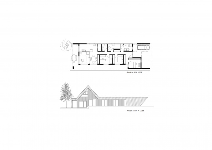 Das Haus steht in und für die Besinnung seiner Bewohner und Errichter auf das Maß der Dinge, tritt traditionell, zeitgemäß wie zeitlos und haptisch erfahrbar in Erscheinung und neigt sich seinem Besucher entgegen. Es vereint die Vorzüge des Wohnens auf einer Ebene mit dem Schutzraum des Daches und die scharfe Kubatur mit Dachüberstand und Verandamotiv, die dem Haus eine bezeichnende Kontur verleihen, v.a. jedoch eine besondere Wohnqualität im Übergang von innen nach außen.
