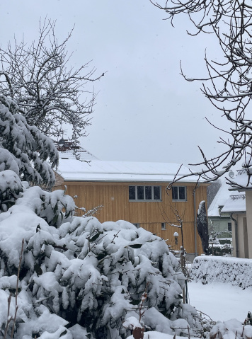 Das Haus mit Holzfassade ordnet sich, auch als Gartenhaus zu verstehen, zwischen den beiden Bestandshäusern ein, es will sich nicht wichtig machen, sondern Teil des Gartens werden und mit ihm verschmelzen. Straßenseitig gibt es nicht nur Nebenraumfenster sondern auch ein deutlich größeres welches mit der Straße interagiert.