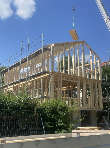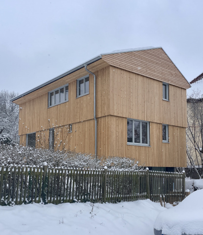 Errichtung eines 2-geschoßigen Wohnhauses in Holzbauweise auf einem massiven Sockel, der an der Straßenseite ein Vollgeschoß ist und auf der Gartenseite zum Kellergeschoß wird.