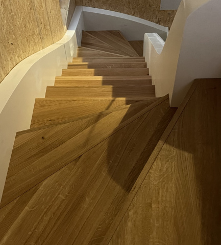Die Kubatur des Hauses orientiert sich sowohl an der vorderen, als auch an der hinteren Seite an den jeweiligen Baufluchten der Häuser rechts und links.