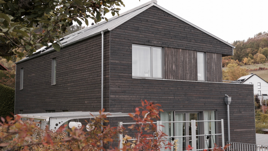 Die Holzkonstruktion ist in Rahmenbauweise ausgeführt, gedämmt ist das Haus mit Holzfasern.