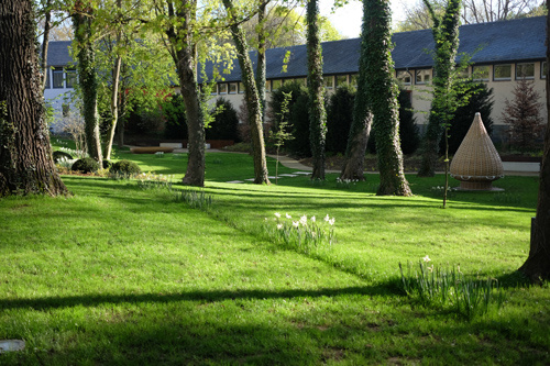 Die Außenanlagen gliedern sich in zwei sehr unterschiedliche Räume. Während der vordere Teil im Bereich der Straße eher urban geprägt ist, besitzt der rückwärtige Teil einen waldähnlichen Charakter. Über Jahrzehnte hat sich hier ein hoher und dichter Baumbestand entwickelt, welcher in seiner Qualität und Atmosphäre im Kontrast zum offenen Eingangsbereich steht.