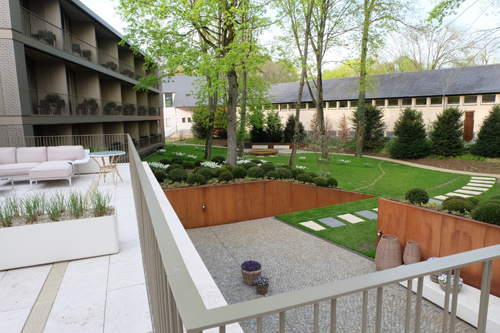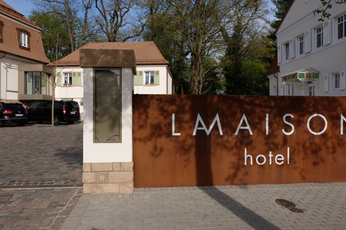 Gestalterisches Ziel bei der Planung der Außenanlagen des Hotel La Maison war es, eine Einheit zwischen diesen beiden Teilen zu schaffen. Einheitliche Freiraummaterialien und Pflanzungen schufen hierbei eine Verbindung und heben den einmaligen Charakter der Außenräume hervor. Der gesamte Freiraum wirkt nun ruhig und elegant, gleichzeitig aber auch kraftvoll. Sämtliche Pflanzflächen erblühen im Frühjahr durch eine Vielzahl von Narzissen und Tulpen.