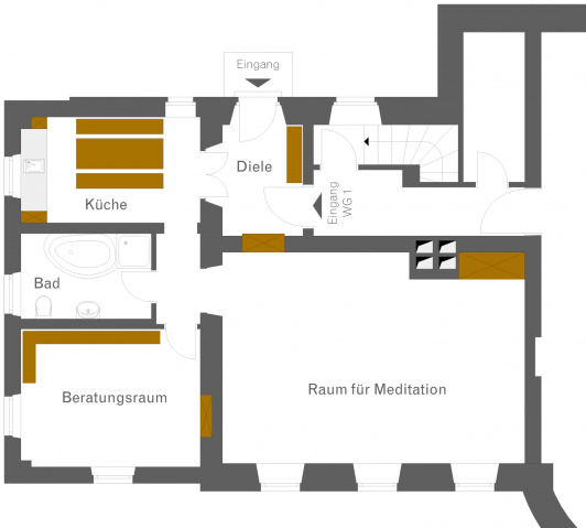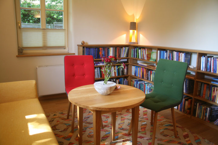 Für die Umnutzung einer Wohnung zu Praxisräumen für Meditation und Körperarbeit in der historischen Villa Ithaka in Weimar ist eine umfassender Innenraumentwurf erarbeitet worden. Die Innenwände erhielten aus denkmalpflegerischen Gründen eine Innendämmung. Der Lehmputz in allen Räumen sorgt für ein ausgewogenes Raumklima. Ein umfassendes Farbkonzept unterstreicht in den Räumen die Unterschiedlichkeit der Nutzung. Die Möbeleinbauten in Eingangsdiele, Teeküche und Beratungsraum wurden für die Ansprüche der Bauherrschaft entwickelt.