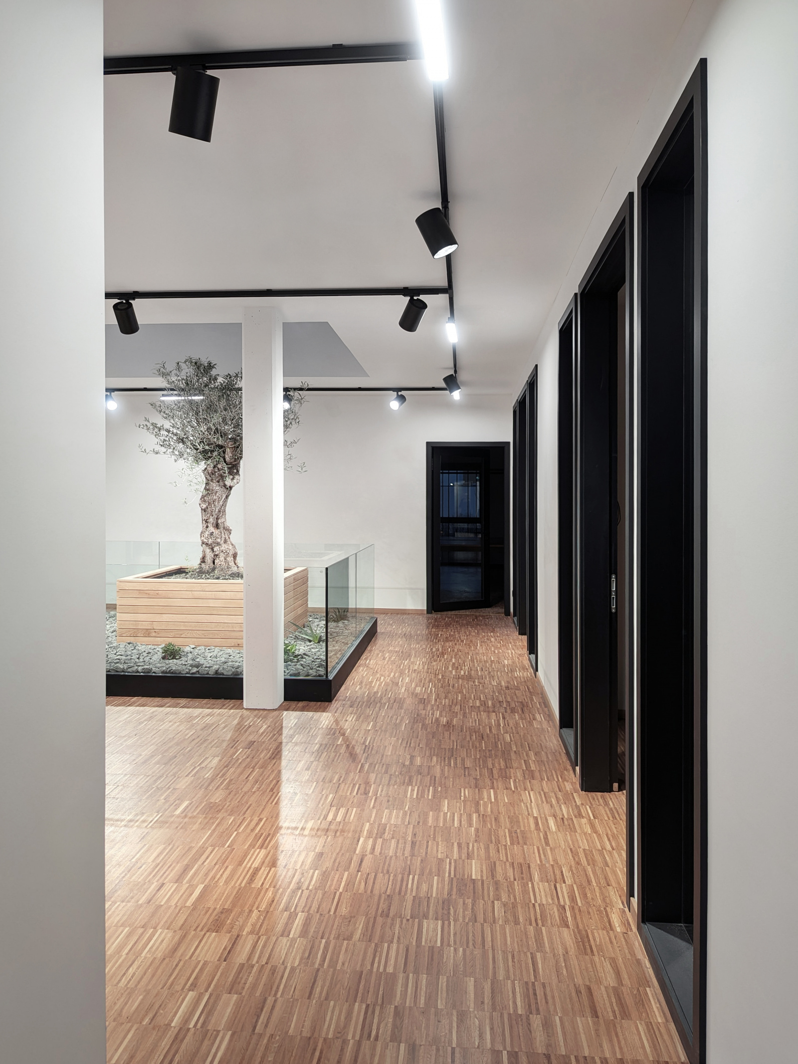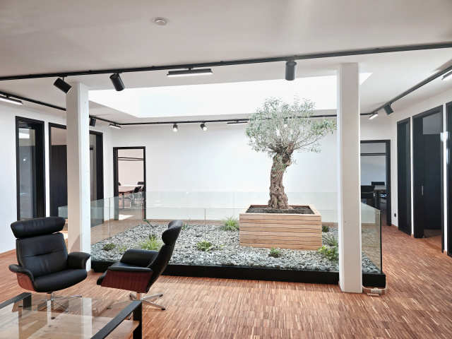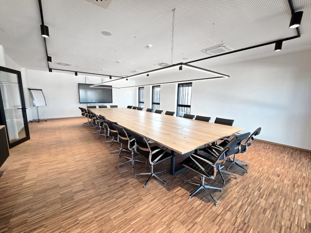 Im EG befinden sich stark verglaste Besprechungs- u. Seminarräume für den Präsenzunterricht der Ausbildung von Schornsteinfeger*innen u. Energieberater*innen. Das in verkohltes Holz (eine traditionelle Holzkonservierung) gefasste OG bietet Platz für Büroräume und weitere Besprechungsräume, die bei Bedarf auch für Unterricht genutzt werden können. Das DG ist eine Hybridfläche für das Zusammenkommen von Angestellten und Auszubildenden.
