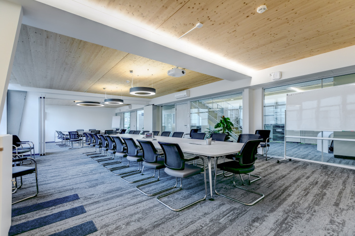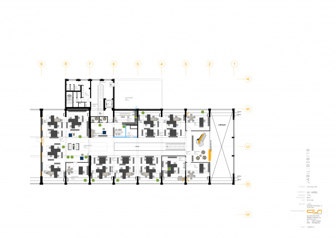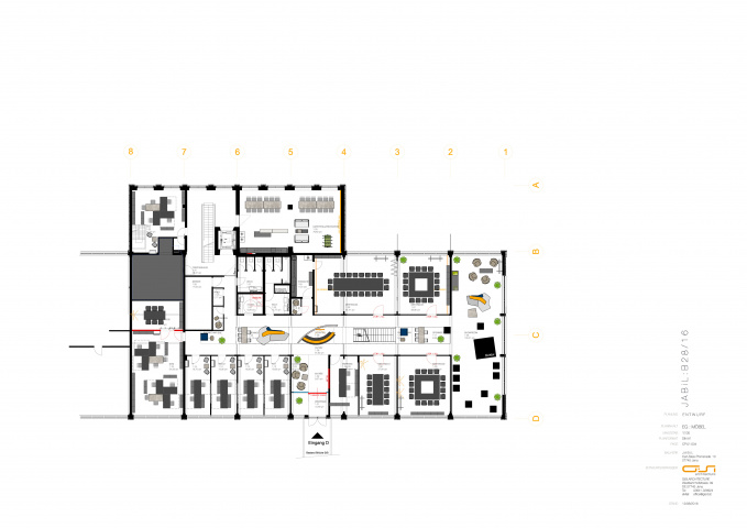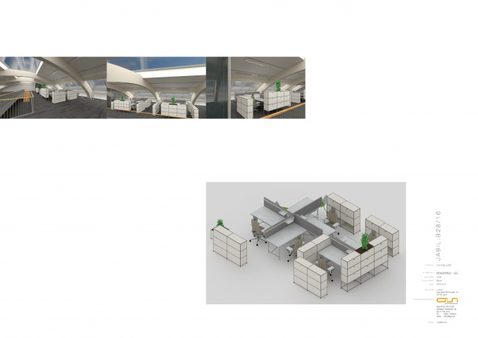 Der denkmalgeschützte Bau 28 in Jena beherrbergt seit März 2017 unteranderem die Jabil Optics Niederlassung Jena. Im Auftrag von Jabil Optics entwickelten wir ein offenes und innovatives Arbeitsumfeld, welches zum einen die Prototypenherstellung und vor allem das Entwicklungszentrum beherbergt. Die Räumlichkeiten erstrecken sich über drei Geschosse, das Basislevel dient der Unterbringung von Laboren und Produktionsstätten, das Antrittsgeschoss wird vornehmlich für den Gäste- und Meetingbereich genutzt und beherrbergt den Showroom, welcher sich über zwei Geschosse erstreckt, das Galeriegeschoss steht ausschlieszlich den internen Nutzungen der Entwicklung und Verwaltung zur Verfügung. Die Ausgestaltung der Räumlichkeiten basiert grundlegend auf einem offenen Konzept, dh. die bauliche Unterteilungen von Nutzungseinheiten fanden nur dort statt wo es funktional notwendig war. In diesen Bereichen setzten wir vorrangig auf die Gliederung durch Glaswände, um den offenen Charakter in der Nutzung zu unterstreichen und zum anderen die baulichen Gegebenheiten zu unterstreichen, bzw. diese besonders herauszuarbeiten. Jabil Optics setzt in seiner offenen Arbeitsweise vor allem auf Kommunikation, auf dieser Grundlage schufen wir verschiedenste Arten von Meetingpoints zwischen den Arbeitsbereichen. Um den gesundheitlichen Aspekten eines moderen Arbeitsplatzes zu entsprechen, wurden neben individuell einstellbaren Bürotischen auch Steharbeitsplätze geschaffen, die sich ebenso als Treffpunkt verstehen. Durch die abwechslungsreiche Ausstattung gibt es für die Mitarbeiter viele Möglichkeiten sich individuell mit den täglichen Arbeitsprozessen auseinander zu setzen. In der Ausgestaltung der Räume legten wir viel Wert auf klare aber warme Farbtöne, somit erzielten wir eine hohe Haufentahlts und damit Arbeitsplatzqualität. Die eingesetzten Materialien orientieren sich im hohen Masz am Bestandswerksstoff : Beton. Das Beleuchtungskonzept basiert auf der optimalen Ausleuchtung der Arbeitsplätze, die Wirkung auf den Auszenraum wurde in diesem Zusammenang aber ebenso beachtet. Durch die Unterstützung von Lichtvouten wird das Tonnendach des Galeriegeschosses in einem besonderen Masz optisch unterstützt.