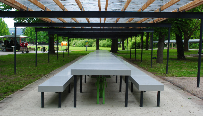 Der Volkspark Oberaue in Jena ist die größte und wichtigste zusammenhängende Grünanlage Jenas. Die Gesamtanlage wurde 2002 als Kulturdenkmal ausgewiesen. Die besondere Qualität des Parks liegt in dem noch heute erlebbaren Zusammenspiel von behutsam gestalteter Landschaft, gartenkünstlerisch ausgestalteten Bereichen und der geschickten Verbindung zur Umgebung. Die Wiederherstellung dieser Qualitäten war unter anderem die Aufgabe der erfolgten Umgestaltung bzw. Sanierung. 2011 wurden die Büros Dane Landschaftsarchitektur und Ulrich Boock Freier Landschaftsarchitekt jeweils für einen Teil der Anlagen auf der Rasenmühleninsel mit der Umgestaltung beauftragt. Ausgehend von der historischen Entwicklung des Volksparks Oberaue in Jena sowie der Gartendenkmalpflegerischen Zielstellung sollten die einzelnen Freiräume im Park wieder deutlich erlebbar werden. Der starke Nutzungsdruck durch die unterschiedlichen Ansprüche der Parknutzer war zu berücksichtigen und besonders sensible Bereiche durch neue Nutzungsangebote an anderer Stelle zu entlasten. So wurde zum Beispiel eine Kegelbahnanlage aus den 80er Jahren in einen Picknickplatz umgewandelt, die Freifläche um das Glashaus neu gestaltet, eine großzügige Boulefläche eingeordnet und eine Slacklineanlage errichtet.