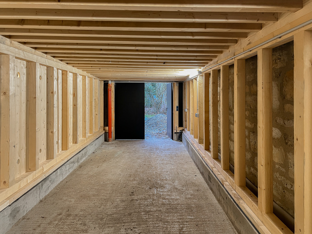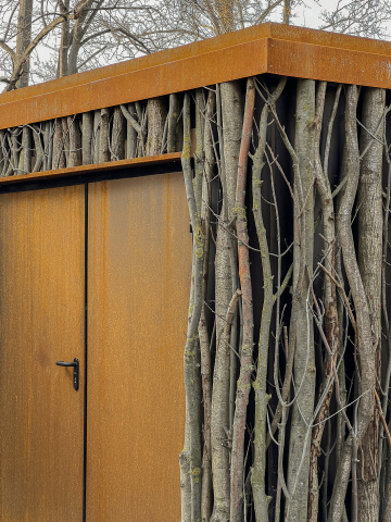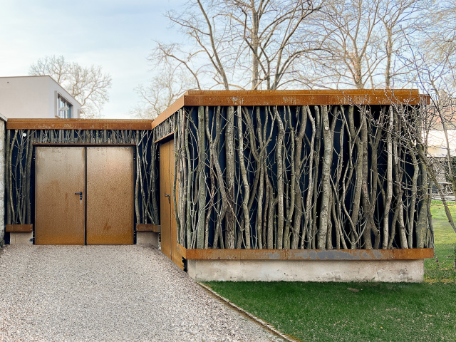 Eine auffällige unauffällige Fassade aus natürlichen Totholzstangen thematisiert den jahrhundertealten Baumbestand des Friedhofs.