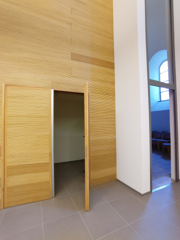 Im Zuge der Instandsetzung des stark sanierungsbedürftigen Kirchbaus haben wir uns auf die Suche nach zukunftsfähigen Nutzungsmöglichkeiten für den im Laufe der letzten Jahre „zu groß“ gewordenen Kircheninnenraum begeben. Die umfangreichen Maßnahmen mit Ertüchtigung von Dach- und Turmkonstruktion, Erneuerung der Glockenanlage und Putzsanierung im Innenraum sollten nicht nur den Gebäudebestand sichern, sondern für die Menschen vor Ort einen Mehrwert mit sich bringen. Ein reversibler Raumteiler mit Servicebereich trennt den 1919 angebauten Chorbereich jetzt vom Kirchenschiff ab. Dadurch entstand ein vielfältig nutzbarer, barrierefreier Ort der Begegnung. Die Gestaltung des Kirchenraumes entstand in Zusammenarbeit mit dem Berliner Künstler Carsten Wirth. Er hat die Ausstattung entworfen.