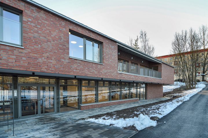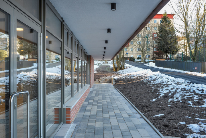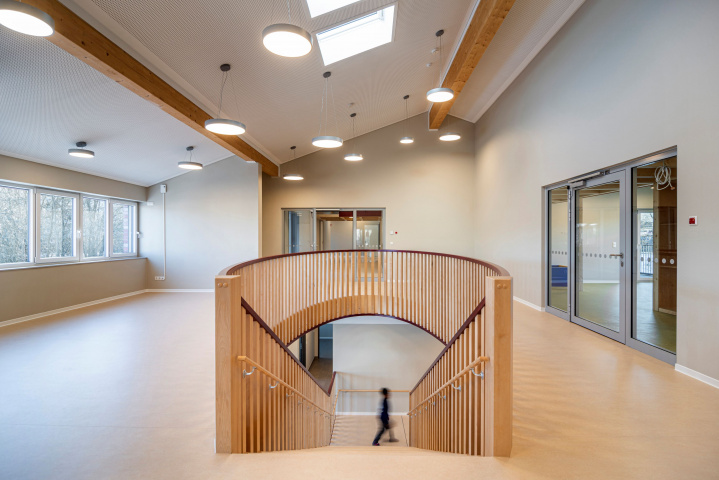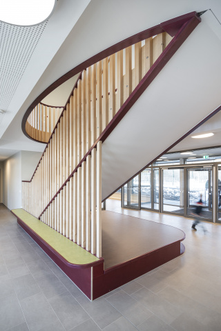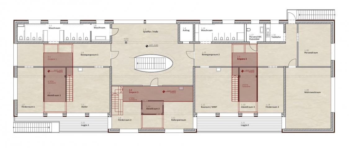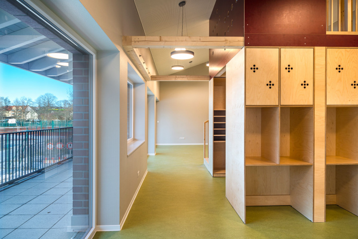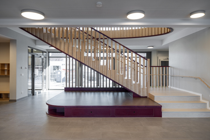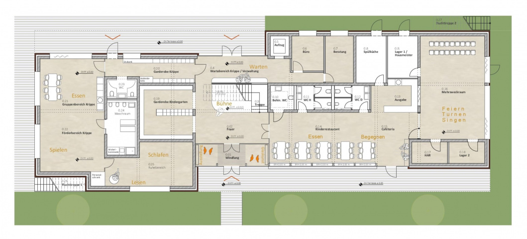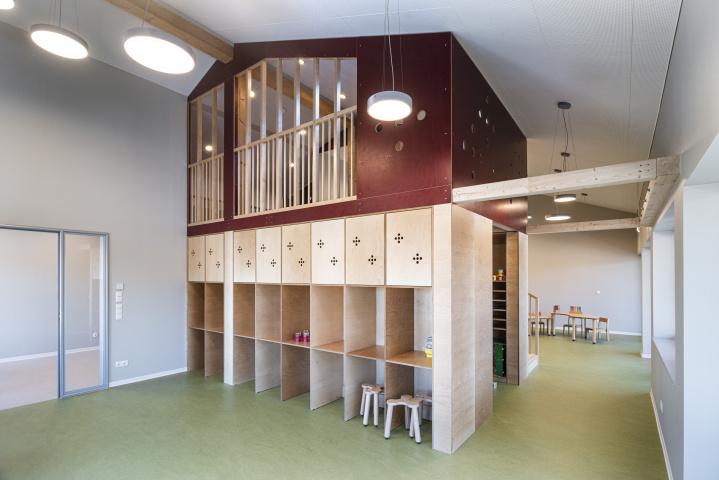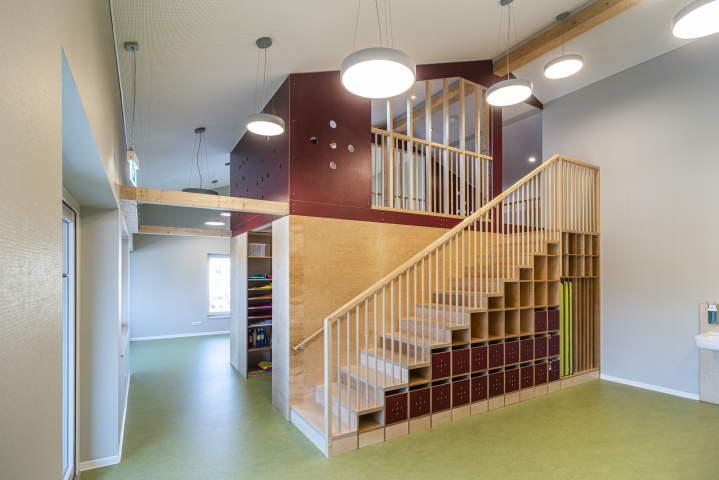 Der Kindergarten bildet mit seinem langgestreckten Baukörper eine klare Raumkante, die einer heterogenen Nutzung im westlichen Planungsgebiet Halt verleiht. Gestaltprägend für den Baukörper ist der Umgang mit der Umgebung. Sowohl der öffentliche Freibereich westlich, als auch der private Freibereich östlich des Gebäudes, schieben sich in den Baukörper – es entstehen bauliche Einschnitte, die die langestreckte Kubatur gliedern und in direkte Kommunikation mit den Innenbereichen treten. Diese Freibereiche gruppieren sich einladend um das zentrale Foyer des Kindergartens, welches raumprägend durch eine Treppe gestaltet wird, die in Ihrer Anordnung Besucher auffängt, in die verschiedenen Funktionsbereiche verteilt und gleichzeitig als Möbelstück gestaltet, hohe Aufenthaltsqualität bietet.