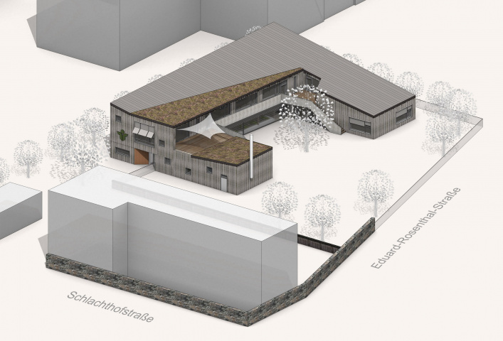 Nach Durchführung eines Städtebauwettbewerbs im Alten Schlachthofgebiet im Norden von Weimar wurde im vorderen Teil des Gesamtgebietes, Rosenthalstraße / Ecke Schlachthofstraße ein Kindergarten eingeplant.