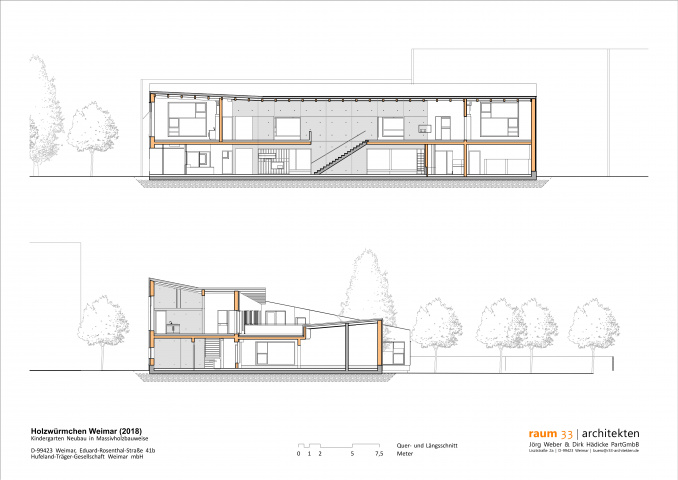 Die Hufeland Träger Gesellschaft Weimar hat das Grundstück erworben um dort ein Kindergarten in massiver Holzbauweise zu errichten. Massive Holzbauweise bedeutet, dass die tragenden Bauteile des Gebäudes zu 100% aus Holz bestehen. Das gewählte System hat einen hohen Vorfertigungsgrad der Bauelemente Wand und Decke und somit eine vergleichsweise Geringe Bauzeit vor Ort. Der Ausbau des Gebäudes wurde vorwiegend mit ökologischen Baustoffen durchgeführt um einen gesunden Ort für die Kinder zu schaffen.
