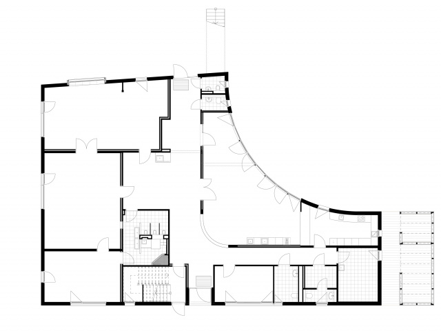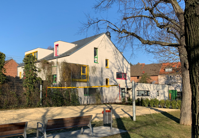 Die Gesamtkapazität beläuft sich auf 90 Kinder. Erkerfenster erlauben individuelle Ausblicke und dienen auch als Rückzugsorte für die Kinder. Der zentral im Erdgeschoss befindliche Multifunktionsraum orientiert sich mit seiner gebogene Fassade zum mittelalterlichen Kirchturm der Bonifatiuskirche hin.