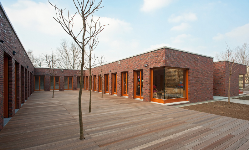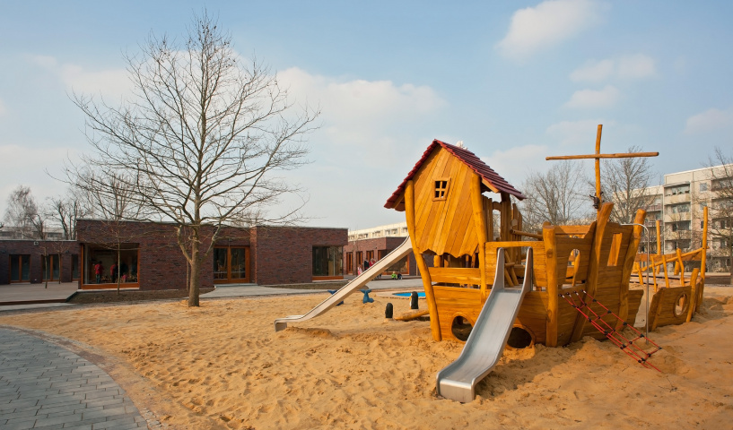 Der Neubau der Kindertagesstätte ARCHE NOAH wurde auf dem Grundstück einer ehemaligen, ungenutzten Förderschule realisiert. Nach Norden nimmt der Neubau über eine Spielstraße sowie eine Vorterrasse den Geländeverlauf auf. Das eingeschossige, nach Süden orientierte, Gebäude ermöglicht sämtlichen Funktionen eine ebenerdige Verbindung zum Garten. Die Form des Gebäudes setzt sich auch einem nach Norden orientiertem Rückgrat sowie durch drei in den Garten greifende Gebäudeflügel mit eingeschobenen Terrassen aus. In diesen befinden sich die Gruppenräume des Kindergartens. Das Rückgrat des Gebäudes nimmt alle infrastrukturell erschlossenen Funktionen auf. Die Nord-Ost-Ecke des Gebäudes bietet einer besonderen Funktion Raum; hier wurde der Andachtsraum realisiert, der über eine große Eckverglasung auch einen Blick zum Kirchturm der Kirchengemeinde Erfurt-Gispersleben erlaubt. Für den Neubau wurde bewusst auf natürliche Materialien und Baustoffe, wie Backstein und Lärchenholz zurückgegriffen.
