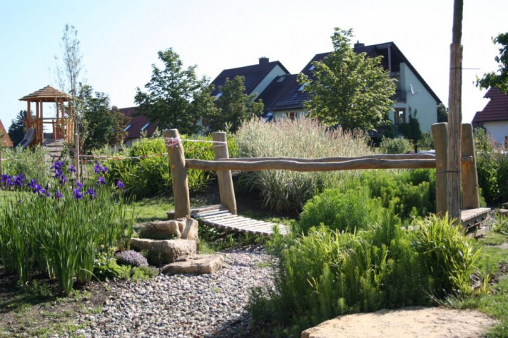 Die Gestaltung des Außenbereiches der KiTa orientiert sich an der pädagogischen Konzeption für den Innenraum des Gebäudes. Basierend auf der Idee, Gruppenräume durch Themenräume zu ersetzen und damit ein altersübergreifendes Spiel zu ermöglichen, erfolgt auch die Zuordnung und Verteilung der Funktionen im Außenraum. Ziel ist es, den Kindern vielfältige Beschäftigungsmöglichkeiten zu bieten und gleichzeitig die soziale Kompetenz sowie die ( fein- / grob- ) motorischen und kreativen Fähigkeiten zu fördern und auszubauen.