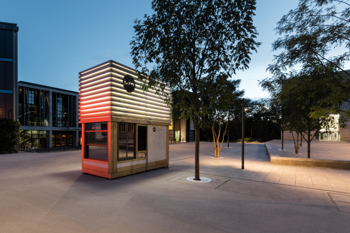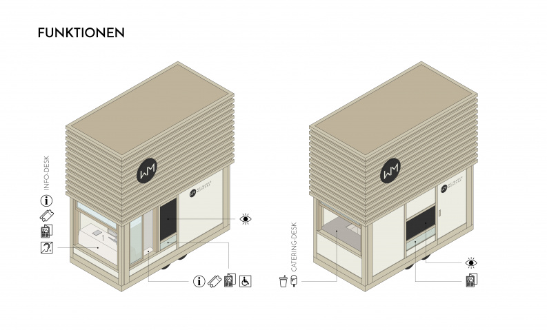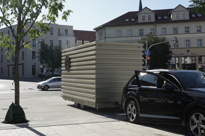 Moderne in Weimar aufmerksam zu machen. Die Klassik Stiftung Weimar lobte hierzu einen Wettbewerb für einen Kiosk vor dem neuen Bauhaus Museums aus. Er sollte zudem transportabel sein, um ihn auch anderswo aufbauen zu können. Das Konzept ist das mobile: Mit abgesenkter Haube ist der Kiosk am Stück als PKW-Anhänger mobil. Bei gehobener Haube entfaltet er seine Signalwirkung und ist damit Sichtbarmachung des Konzeptes: Besucher erhalten hier Informationen und Eintrittskarten rund um die Weimarer Moderne aber auch Snacks und Getränke. Er ist damit ein vielseitiger und zentraler Anlaufpunkt nicht nur vor dem neuen Bauhaus Museum in Weimar.