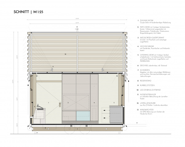 Die Besonderheit des Kiosks ist seine Mobilität. Mit gesenkter Haube, hochgeklappten Schürzen und montierter Deichsel, ist er Anhänger mit TÜV. Hier liegt die Besonderheit: Er muss dem Baurecht und der Straßenverkehrszulassungsordnung (StVZO) entsprechen. Baurechtlich muss er genehmigungsfrei sein, damit eine Standgenehmigung genügt. Somit muss alles auf 10m2 Grundfläche und nach StVZO max. 2,55m Breite untergebracht werden. Um die baurechtliche Höhe von 5m auszureizen und nach StVZO unter 4m zu bleiben, muss die Haube absenkbar sein. Solche Anhänger wurden bisher nur von zwei Unternehmen in Deutschland gebaut. Und nicht zuletzt sollte er einfach mit PKW transportiert werden können, wodurch 3,5t nicht überschritten werden dürfen, die er knapp ausreizt.