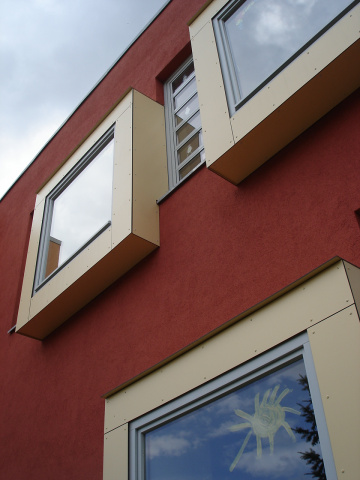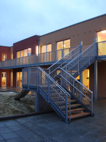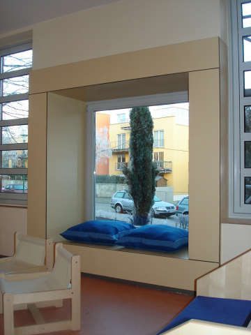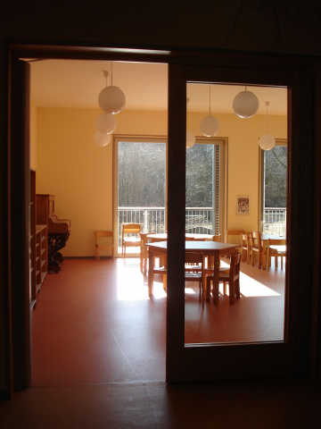 Der Standort der Kita „Am Waldblick“ gelegen am Fuße des nördlichen Steigerwaldhanges stellt eine enge Verbindung zwischen städtischen Umfeld und Natur her. Die Einordnung des Baukörpers in die vorhandene Umgebung lässt eine großzügige Außenraumgestaltung zu. Das Eingangsgeschoss wird straßenseitig ebenerdig erschlossen, dagegen ist die 2. Ebene hangseitig als ebenerdiges Geschoss nutzbar. Alle zum Garten orientierten Gruppenräume haben einen separaten Ausgang auf die vorgelagerte Spielfläche. Nach außen erscheint der Baukörper schlicht und ist entsprechend der inneren Strukturierung dreigeteilt. Warme Farben und große lichtdurchflutete Räume bieten den Kindern Geborgenheit und eine anregende Atmosphäre. Im Mittelteil befinden sich zentrale Funktionen, die angrenzenden Gebäudeflügel nehmen die Gruppenräume mit gemeinsam nutzbarem Spielbereich, Garderobe und Sanitärräumen auf. Im Obergeschoss befinden sich neben weiteren Gruppenräumen ein Therapieraum und eine Terrasse mit „Waldblick“.