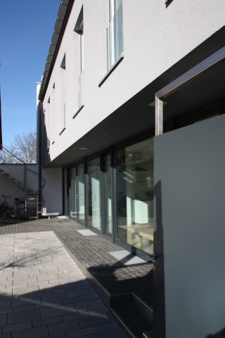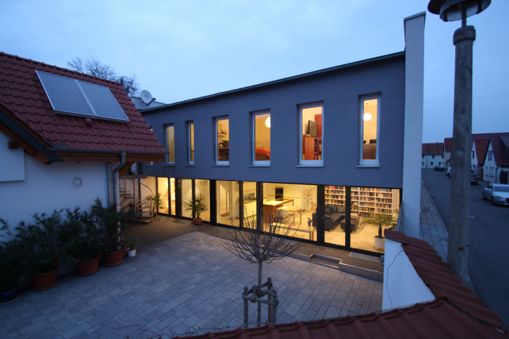 Halt findet das kleine Ensemble aus Nebengebäude, Hof und neuem Einfamilienhaus durch eine rahmende weiße Mauer. Nur kleine Einblicke werden von außen gewährt. Hofseitig öffnet sich das neue Wohnhaus beinah komplett. Die Südwestfassade versorgt das Haus mit Licht, Sonnenwärme und Frischluft.
