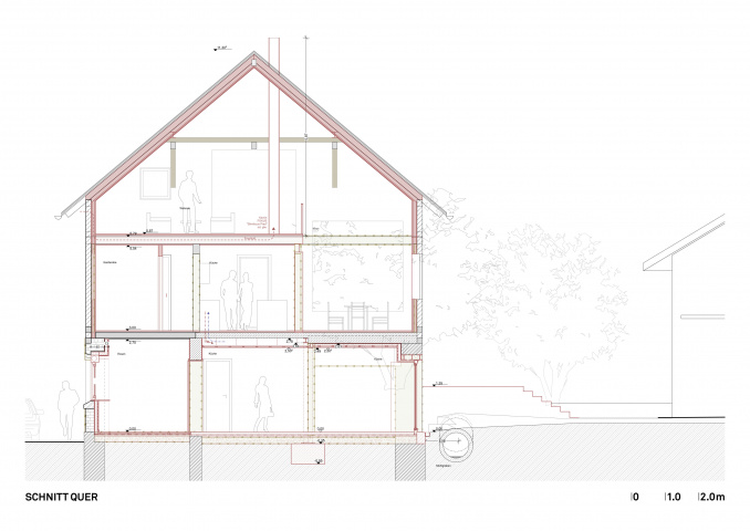 Die ehemalige Mühle im Ortszentrum des beschaulichen Rhöndorfs Roßdorf wurde grundlegend saniert und an aktuelle Wohnbedürfnisse angepasst. Die separierte Erdgeschosswohnung wird weiterhin über den historischen Eingang erschlossen. Für die großzügige zweite Wohneinheit in Ober- und Dachgeschoss wurde an der gegenüberliegenden Westfassade ein ebenerdiger Zugang mit direkter Verbindung zum Garten geschaffen. Küche und Wohnraum verschmelzen hier über einen großzügigen Luftraum und große Fensteröffnungen zum Zentrum des Familienalltags.