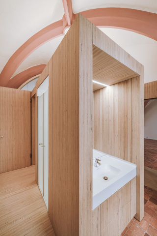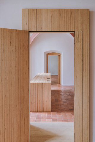 Planungsziel war es, die unter Denkmalschutz stehende Bausubstanz zu erhalten, als solche freizustellen und die neuen Funktionsmöbel aus Holzwerkstoffplatten als Insellösungen in den historischen Kontext zu integrieren, um eine nachhaltige Nutzung der historischen Räume zu ermöglichen.