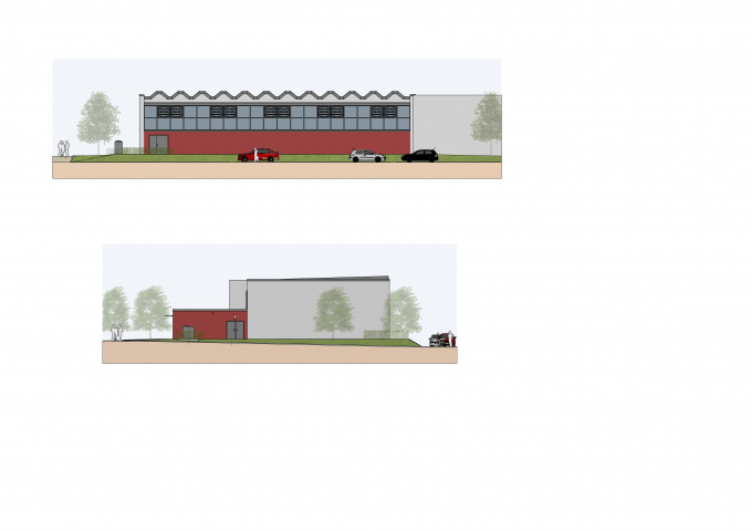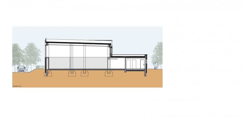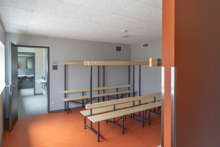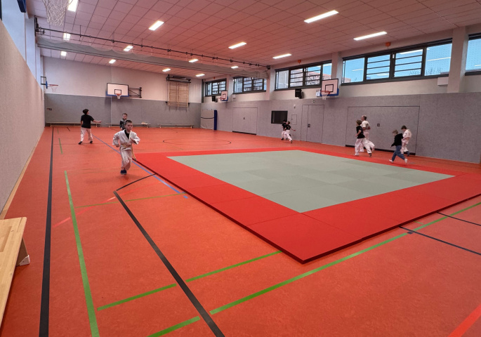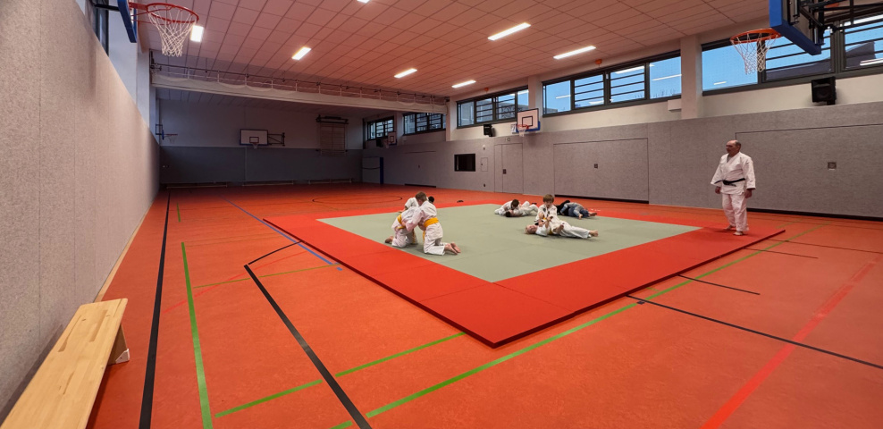 Die “Zweifelderhalle” umfasst 411 m2 Nutzfläche. Die gesamte Nettogrundfläche inklusive Flur-, Sanitär- & Umkleidebereiche beträgt 670 m2.