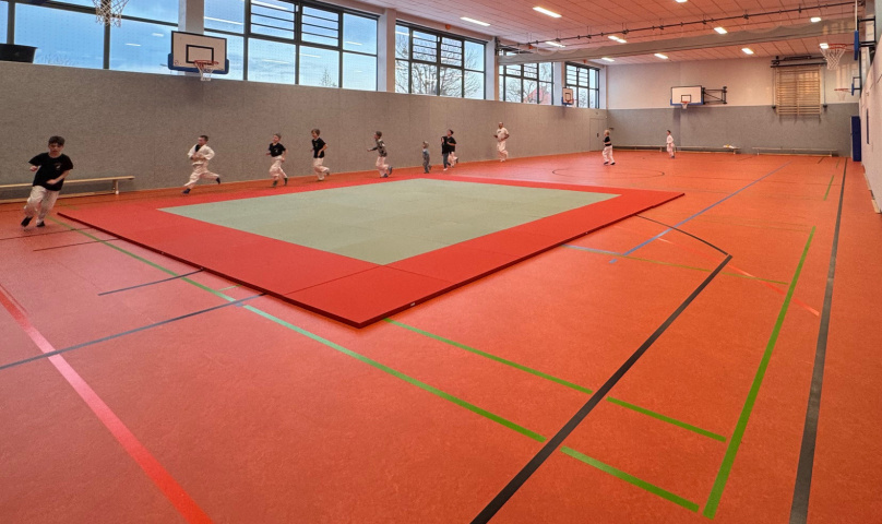 In der Halle gliedern kontrastreiche Linierungen deutlich die einzelnen Spielflächen für Basketball, Volleyball, Handball und Badminton.