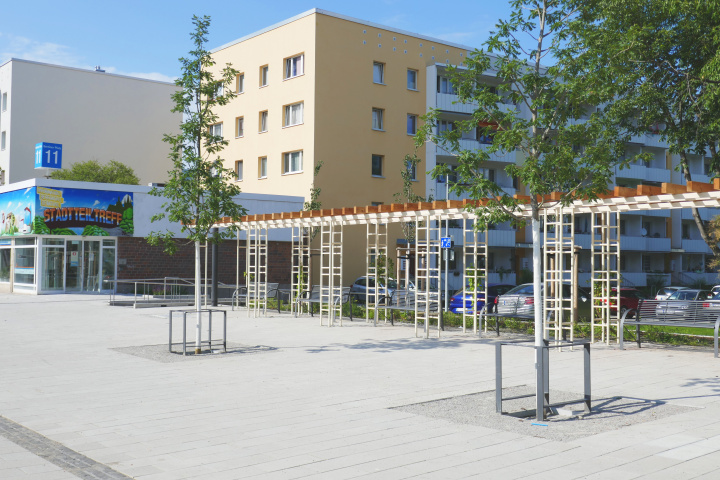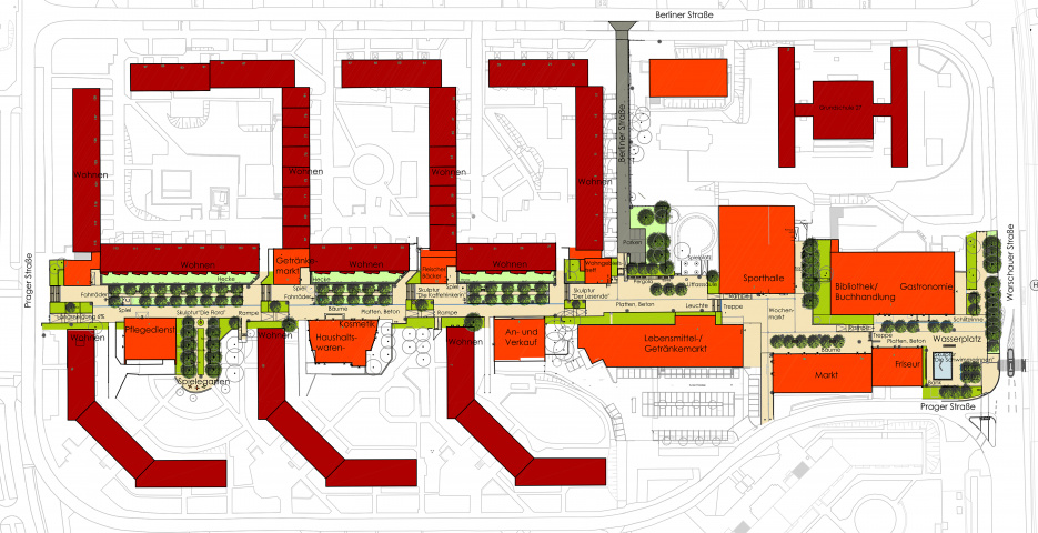 Die Fußgängerzone Berliner Platz war nach 40 Jahren verschlissen. Der ehemals hohe gestalterische Anspruch und die zeittypische Formensprache aus Hochbeeten,großen Belagsplatten, Wasseranlagen, Alleen und figürlichen Kunstobjekten wurden weitgehend beibehalten und attraktiviert. Unter Berücksichtigung der Bürgermeinung wurde der marode Baumbestand weitestgehend durch neue Bäume ersetzt. Es erfolgte ein grundhafter und barrierefreier Ausbau der befestigten Flächen, die Erneuerung der Beläge sowie der Treppen, Rampen und Beleuchtung. Gestalterische Akzente setzen das neue Wasserspiel, die neu angelegten Hochbeete sowie die sanierten Kunstobjekte. Versiegelte Flächen wurden reduziert zugunsten wasserdurchlässiger Beläge und Vegetationsflächen. Bänke und Spielelemente laden zum Aufenthalt ein.