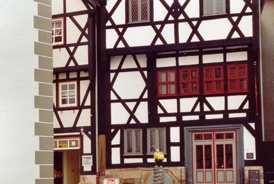 Sanierung und Ausbau umfassen den weitgehenden Erhalt und die konstruktive Komplettierung der offenen Stockwerke des spätmittelalterlichen Ständerbaues aus der Zeit nach 1441, dessen Struktur unter Wiederverwendung geringer, originaler Restsubstanz bereits Anfang der neunziger Jahre rekonstruiert wurde. Die Nutzung als Kunstgalerie korrespondiert mit den relativ stützenfreien Geschossebenen, die trotz ausgeführter Innendämmung die Ständerkonstruktion der Außenwände über drei Galerieetagen sichtbar läßt. Die Geschossdecken im Galeriebereich sind nach unten offen sichtbare, genutete Holzbohlenlagen (Lärche) auf Deckenbalken. Die Raumoberflächen der Galerie folgen der Ausstellungskonzeption des White Cube (weiße Holzlasuren an Ständern, Dielen und Decken). Abgeschlossene Räume wie Büro/ Küche/ WC sind als reversible Einbauten in Trockenbau eingestellt. Einen denkmalpflegerischen Schwerpunkt bildet die nach Freilegung erfolgte Sanierung der Gewölbetonne (Buntsandstein) des Kellers sowie der Sandsteinplattenbelag einer ehemaligen Hausdurchfahrt im Erdgeschoss. Das Dachgeschoss wurde als Einliegerwohnung ausgebaut.