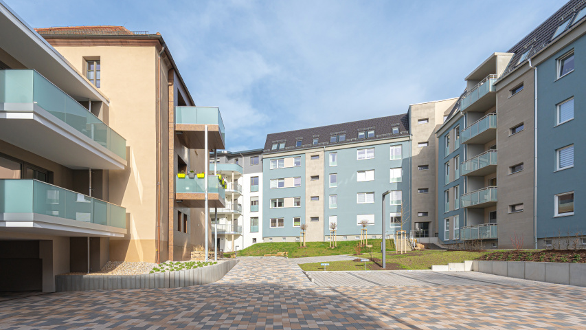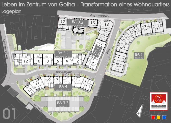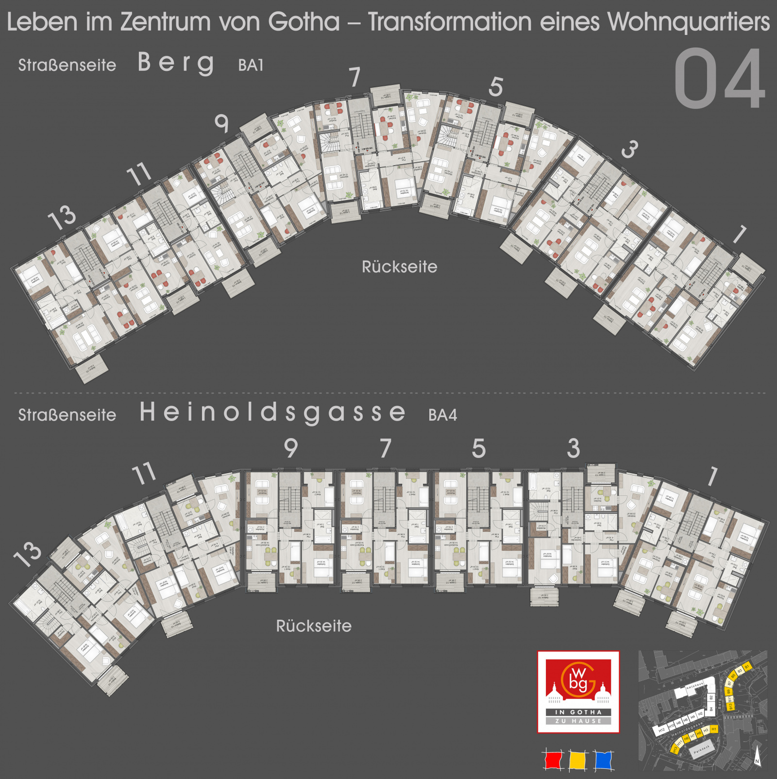 Mit der in vier Bauabschnitte unterteilten Entwicklung des innerstädtischen, nur drei Gehminuten vom Hauptmarkt gelegenen, Wohnquartiers Berg / Heinoldsgasse / Augustinerstraße hatte sich die Wohnungsbaugenossenschaft Gotha e.G. einer Mammutsaufgabe gestellt. Bereits mit Planungsbeginn im 2. Quartal 2017 war klargeworden, dass die Transformation von insgesamt 22 zur Wendezeit fertiggestellten Plattenbauten zu modernen und energieeffizienten Gebäuden nicht im bewohnten Zustand erfolgen konnte. Die auf Basis der Wohnungsbauserie WBR 85 errichteten Bauten waren augenscheinlich durch eine Reihe von Defiziten geprägt. Diese äußerten sich u.a. in einer fehlenden Barrierefreiheit aller Wohneinheiten, in nicht zeitgemäßen und damit zunehmend weniger gefragten Wohnungsgrundrissen, in wachsenden Betriebskosten infolge bauphysikalischer und energetischer Probleme und nicht zuletzt in dem im Gebäudealter begründeten moralischen und physischen Verschleiß von Fassaden und Bauwerksqualitäten. Bereits mit der ersten Ideenfindung verfolgte die Genossenschaft konsequent den Denk- und Realisierungsansatz einer gesamtheitlichen Quartiers-entwicklung. So wurden ergänzend zur Komplexsanierung der sich bereits im Eigentum befindenden Plattenbauten auch die Revitalisierung des denkmalgeschützten vormaligen Amtshauses aus dem Jahr 1669 und die Schließung der zwei an das Plattenbauensemble bzw. Amtshaus angrenzenden Baulücken durch Neubauten in das Gesamtvorhaben integriert. Die Genossenschaft erwarb dazu die betreffenden Liegenschaften als auch das Straßengrundstück der Heinoldsgasse. Damit eröffnete sich die Möglichkeit zu einer umfassenden und abschließenden Quartierslösung, die in eine hochwertige Gestaltung der zugehörigen Freianlagen eingebettet werden konnte. Im rückwärtigen Bereich wurde zudem ein bestehender Parkplatz unter Nutzung der topographischen Verhältnisse zu einem zweigeschossigen Parkdeck entwickelt und so die Stellplatzanzahl ohne eine relevante zusätzliche Versiegelung innerstädtischen Grüns verdreifacht. Mit Vorhabenabschluss präsentiert sich im Stadtzentrum ein städtebaulich geschlossenes, gut strukturiertes und zukunftsfähiges Wohnquartier. Die erreichte gestalterische und bauliche Qualität des Ensembles, bestehend aus 203 neu geschaffenen bzw. umgestalteten Wohneinheiten mit nachgefragten Grundrisslösungen, findet Ausdruck in einer vielfältigen, durch ein stabiles soziales Gefüge geprägten Bewohnerstruktur. Man lebt und wohnt gern hier in Gothas Mitte.