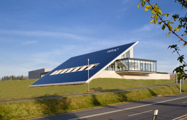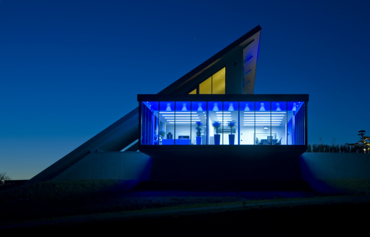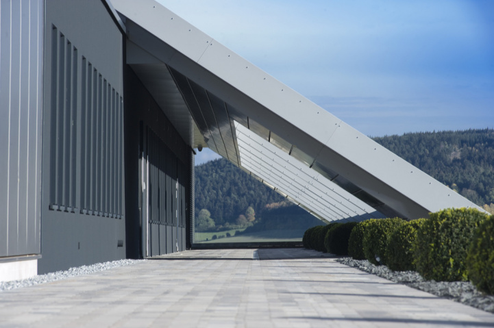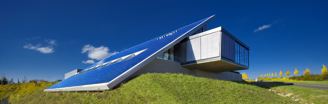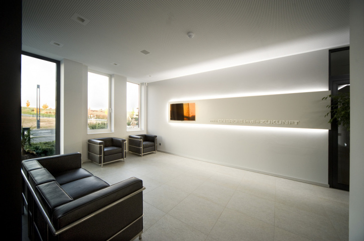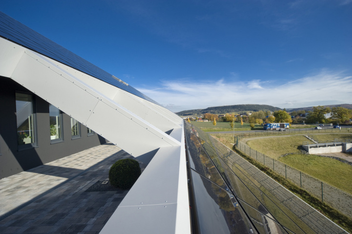 Auf der Südseite wurde ein großzügiges Band aus Öffnungen in das Photovoltaiksegel eingearbeitet. Durch die Schrägstellung des Segels werden die Büroräume verschattet und es entsteht ein teilweise überdachter Außenbereich, der eine vorgelagerte, universell nutzbare Fläche im Freien formuliert. Hier haben unter anderem die Mitarbeiter bei schönem Wetter die Möglichkeit, mit einem einmaligen Blick über die Stadt ihre Pause zu verbringen und neue Kraft für die anstehenden Aufgaben zu tanken.