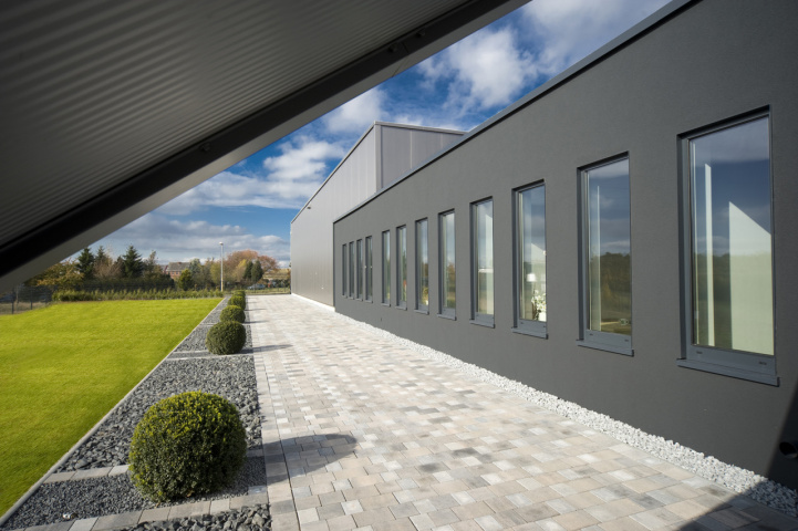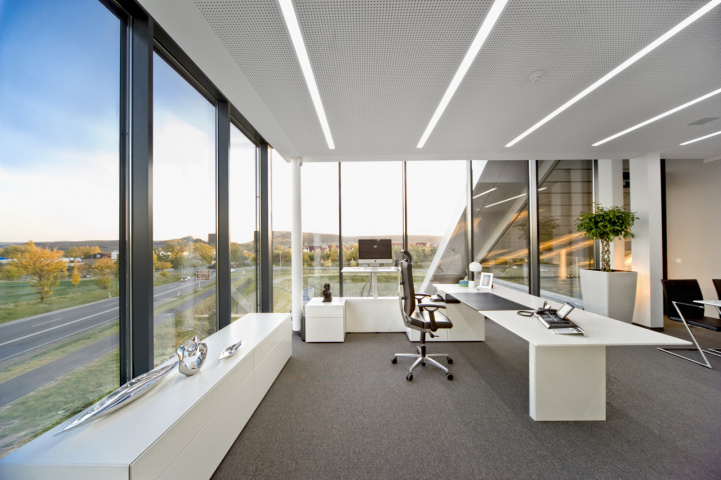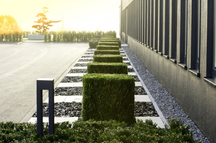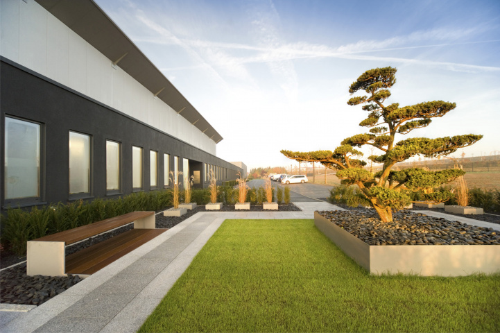 Die Gestaltung der Außenanlagen ist strikt auf die Linien der Fassaden abgestimmt. Genau wie bei der Lochfassade wird mit einem wiederkehrenden strengen Wechselspiel der Strukturen gearbeitet. Steinflächen und Bepflanzungen in geometrischen Formen gefasst, werden, unterstützt durch die integrierten Beleuchtungselemente, wirkungsvoll in Szene gesetzt. Zwischen Eingangsbereich und Besprechungsraum ist auf der Nordseite vor dem Gebäude der Platz der Begegnung als Fläche für interaktive Veranstaltungen rund um das Unternehmen ebenso markant wie die restliche Außenanlage strukturiert und gestaltet.