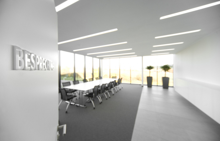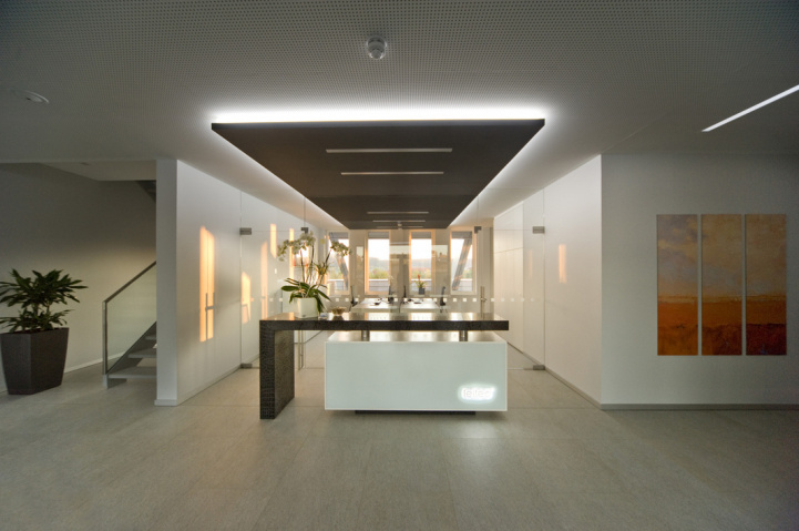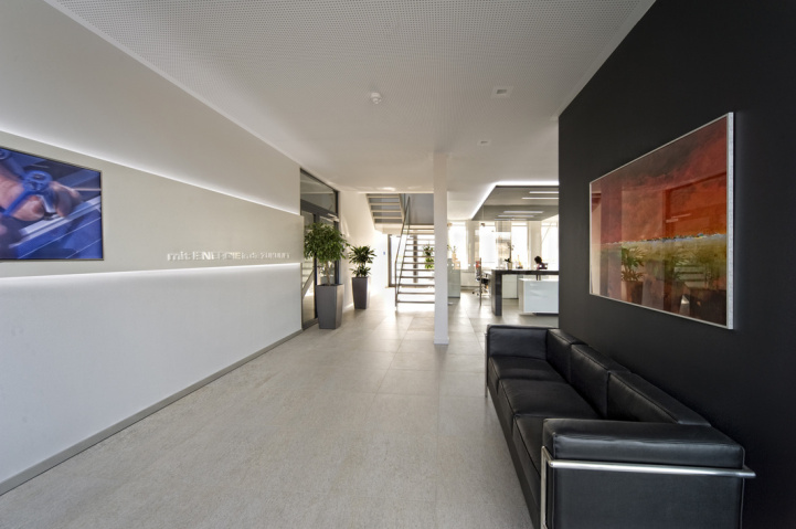 Funktionales Herzstück des Gebäudes ist der langgestreckte Bürotrakt. Er ist in Längsrichtung von einem zentralen Flur erschlossen. Die einzelnen Büro- und Funktionsräume sind beidseitig an den Flur angelagert. Auf der Ostseite mündet der Flur in den Besprechungsbereich mit dem angrenzenden Büro der Geschäftsleitung. Hier schiebt sich der Riegel markant als frei schwebender Körper über die topographische Kante hinweg in Richtung des Straßenraumes. Die Kompaktheit des langgestreckten Baukörpers löst sich an dieser Stelle auf, lässt Ein- und Ausblicke zu und erzeugt somit eine bewusste Korrespondenz zwischen Innen- und Außenraum. Der Haupteingang öffnet die strikte zweihüftige Organisationstruktur in der Nähe des Kopfbaues auf der Nordseite. Ihm gegenüber sind die Anmeldung und eines der beiden Treppenhäuser zum Obergeschoss angeordnet. Im Obergeschoss befinden sich weitere Büros, ein Aufenthalts-Ausstellungsbereich und ein Technikraum.